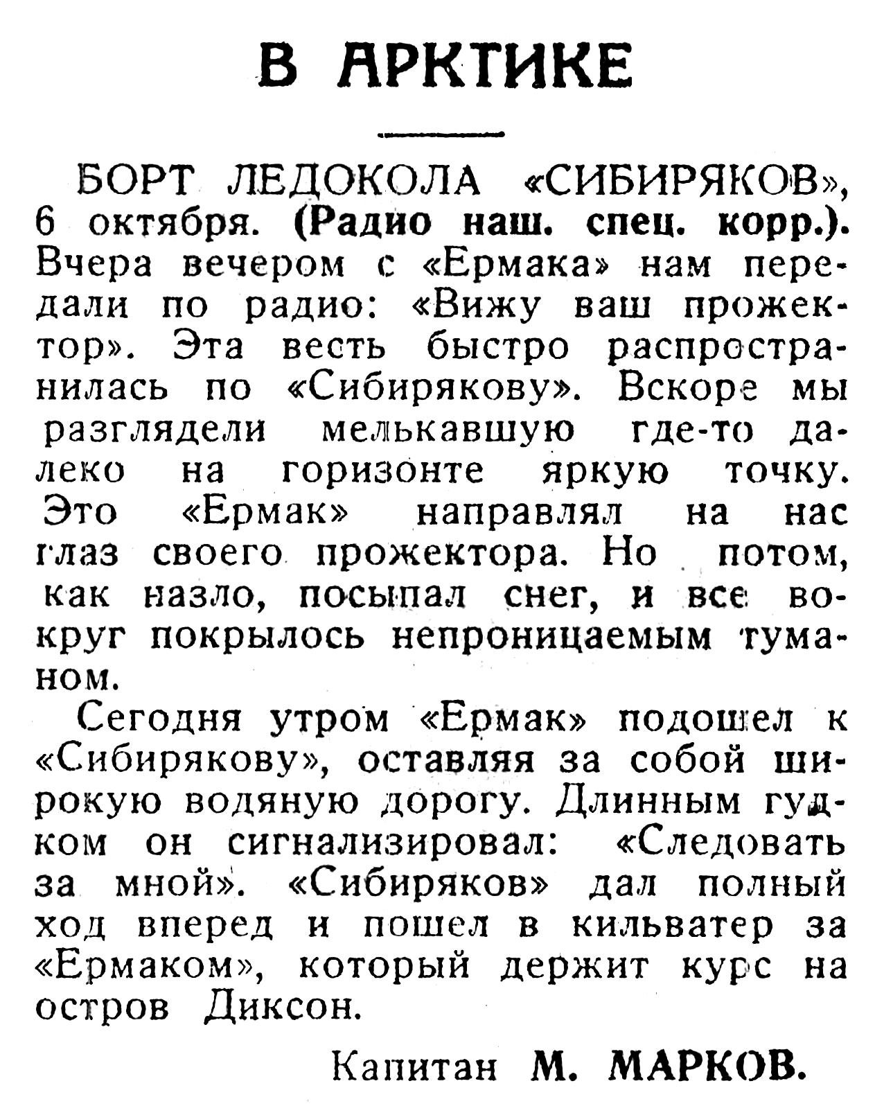 НА БОРТУ ЛЕДОКОЛЬНОГО ПАРОХОДА «СИБИРЯКОВ», 12 октября. (Спец. корр. «Правды»). Тридцать два дня «Сибиряков» стоял во льдах у берегов Северной Земли. Пять суток с огромными трудностями пробивался к нему на выручку ледокол «Ермак». 6 октября «Ермак», наконец, подошел к «Сибирякову» и, не останавливаясь, повел его сквозь льды.