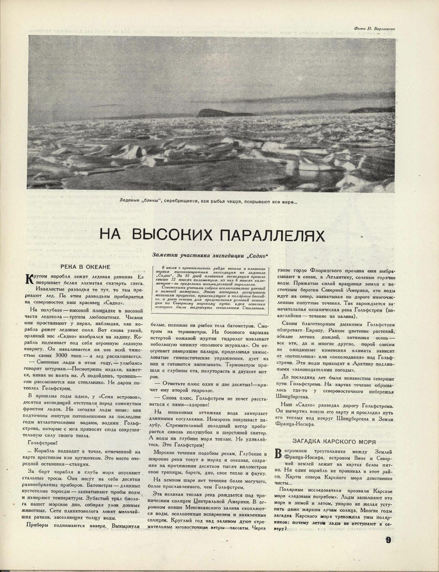 Первая советская высокоширотная экспедиция на ледокольном пароходе „Садко” под командованием капитана Николая Михайловича Николаева стартовала из Архангельска 8 июля 1935 г. Перед ее участниками была поставлена задача провести исследования в Гренландском море, обследовать „белые пятна” к северу от Шпицбергена, Земли Франца-Иосифа и в северной части Карского моря, а также обеспечить сводками погоды перелет летчика Сигизмунда Леваневского на самолете Ант-25 через Северный полюс в Америку, запланированный на лето 1935 г. (Как известно, по техническим причинам, этот перелет был прерван.) Для проведения научных наблюдений „Садко” был оснащен самыми современными приборами, на его борту было оборудовано пять научно-исследовательских лабораторий.