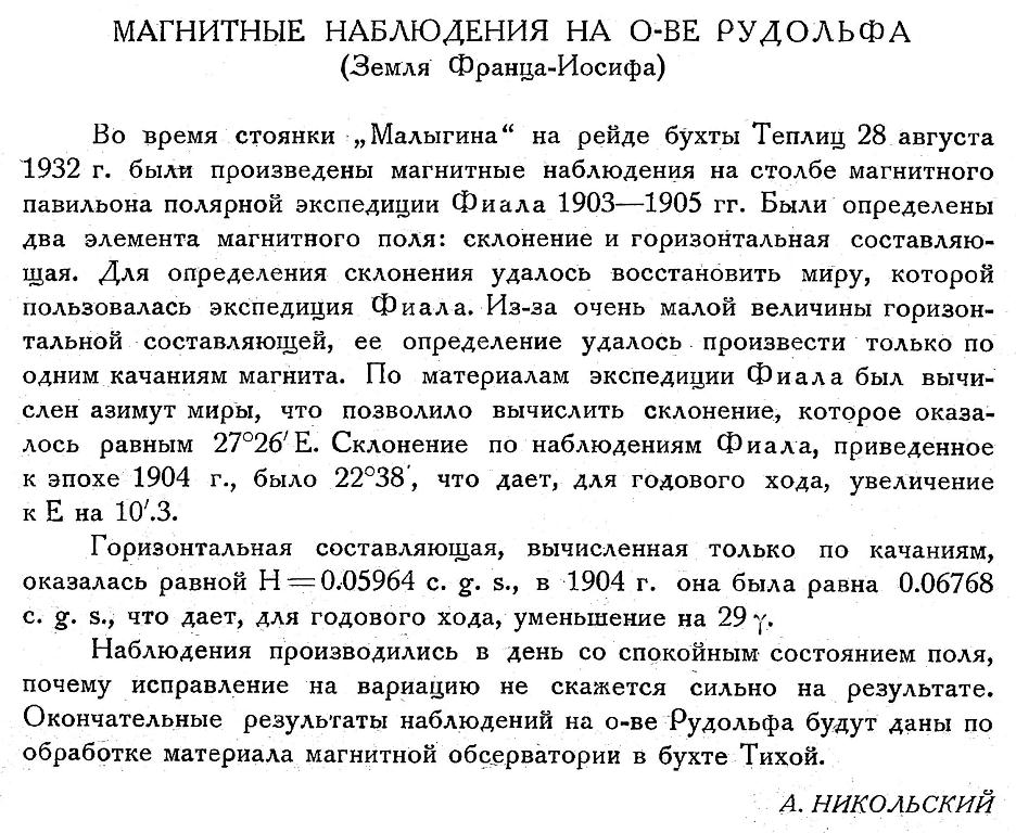Во время стоянки „Малыгина" на рейде бухты Теплиц 28 августа 1932 г. были произведены магнитные наблюдения на столбе магнитного павильона полярной экспедиции Фиала 1903—1905 гг. Были определены два элемента магнитного поля: склонение и горизонтальная составляющая. Для определения склонения удалось восстановить миру, которой пользовалась экспедиция Фиала. Из-за очень малой величины горизонтальной составляющей, ее определение удалось произвести только по одним качаниям магнита. По материалам экспедиции Фиала был вычислен азимут миры, что позволило вычислить склонение, которое оказалось равным 27°26'Е. Склонение по наблюдениям Фиала, приведенное к эпохе 1904 г., было 22°38', что дает, для годового хода, увеличение к Е на 10'.3.