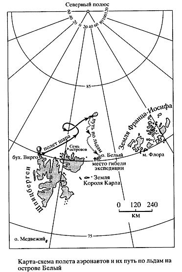 К весне 1896 г. шар был готов. Отлет наметили на июль, когда обычно дуют ровные южные ветры. От Шпицбергена до Северного полюса -1200 км. Андре планировал, что на их преодоление потребуются два дня, а на остающиеся 2300 км до берегов Америки - четыре. Кроме того, имелся запас газа еще на 24 дня, гарантирующий от всяких случайностей.
