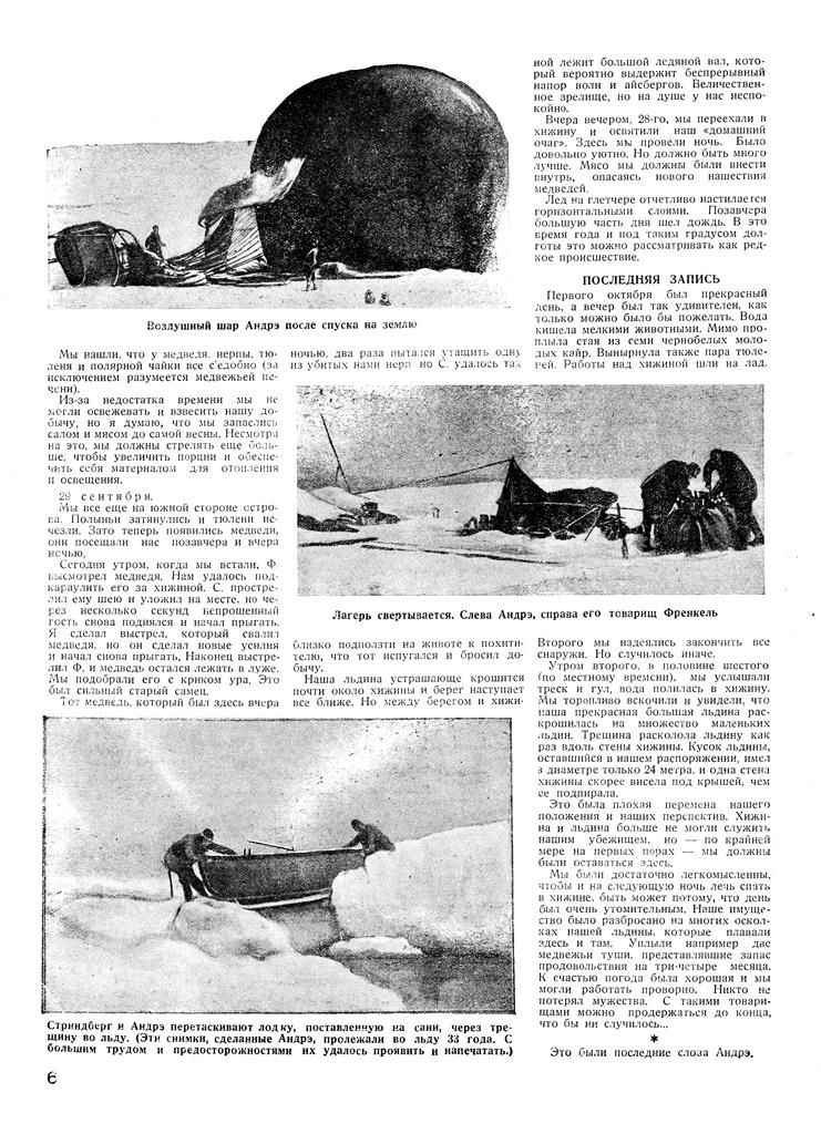В предисловии переводчика говорилось: "В последнее время и печать, и публика очень много интересовались участью знаменитого воздухоплавателя Андре, рискнувшего отправиться на воздушном шаре к неведомому до сих пор Северному полюсу... Напечатанное ниже начало дневника имеет несомненно громадное значение, так как дневник этот до сих пор единственный документ, взятый из реальной действительности, и по всем признакам принадлежит перу знаменитого воздухоплавателя".