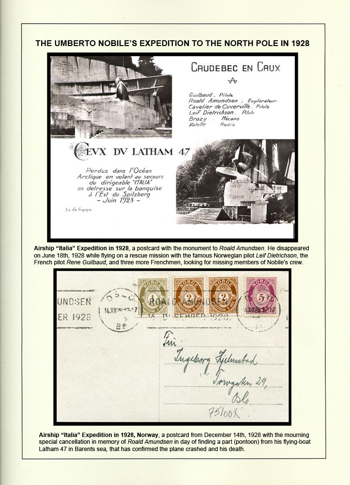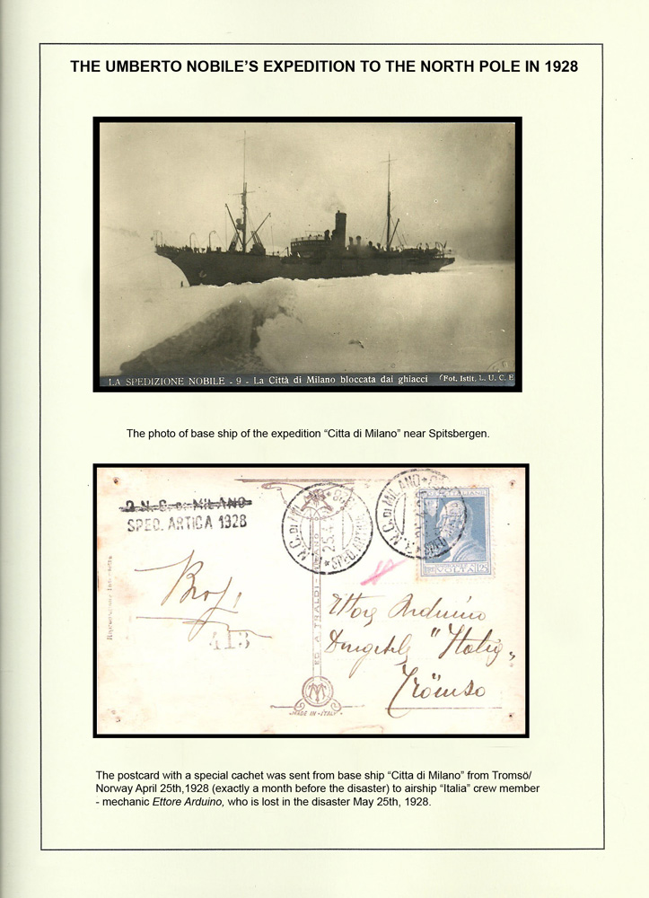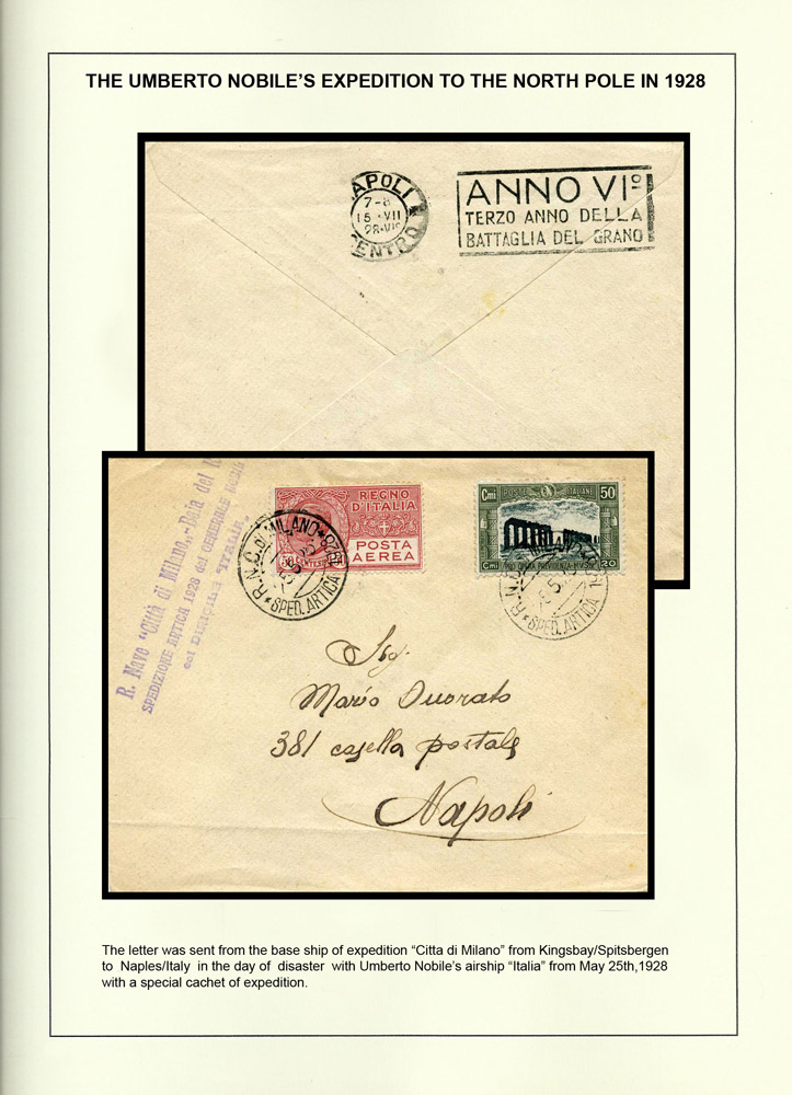 Поскольку вся почта погибла вместе с дирижаблем "Италия", то почтовые материалы экспедиции относятся к периоду до старта дирижабля "Италия" Умберто Нобиле к полюсу и почте судна сопровождения экспедиции "Citta di Milano":