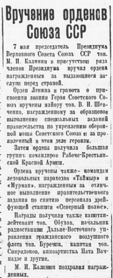 За отличное выполнение правительственного задания о снятии персонала дрейфующей станции «Северный полюс» наградить экипаж и экспедиционный состав судов «Таймыр», «Мурман», «Мурманец» и «Ермак»: