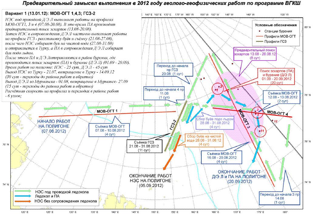 По словам Шкатова, в экспедиции, начавшейся 10 августа и завершившейся 11 октября 2012 года, приняли участие два гражданских судна, ледоколы "Диксон" и "Капитан Драницин", а также две научно-исследовательские подводные лодки специального назначения ВМФ России.