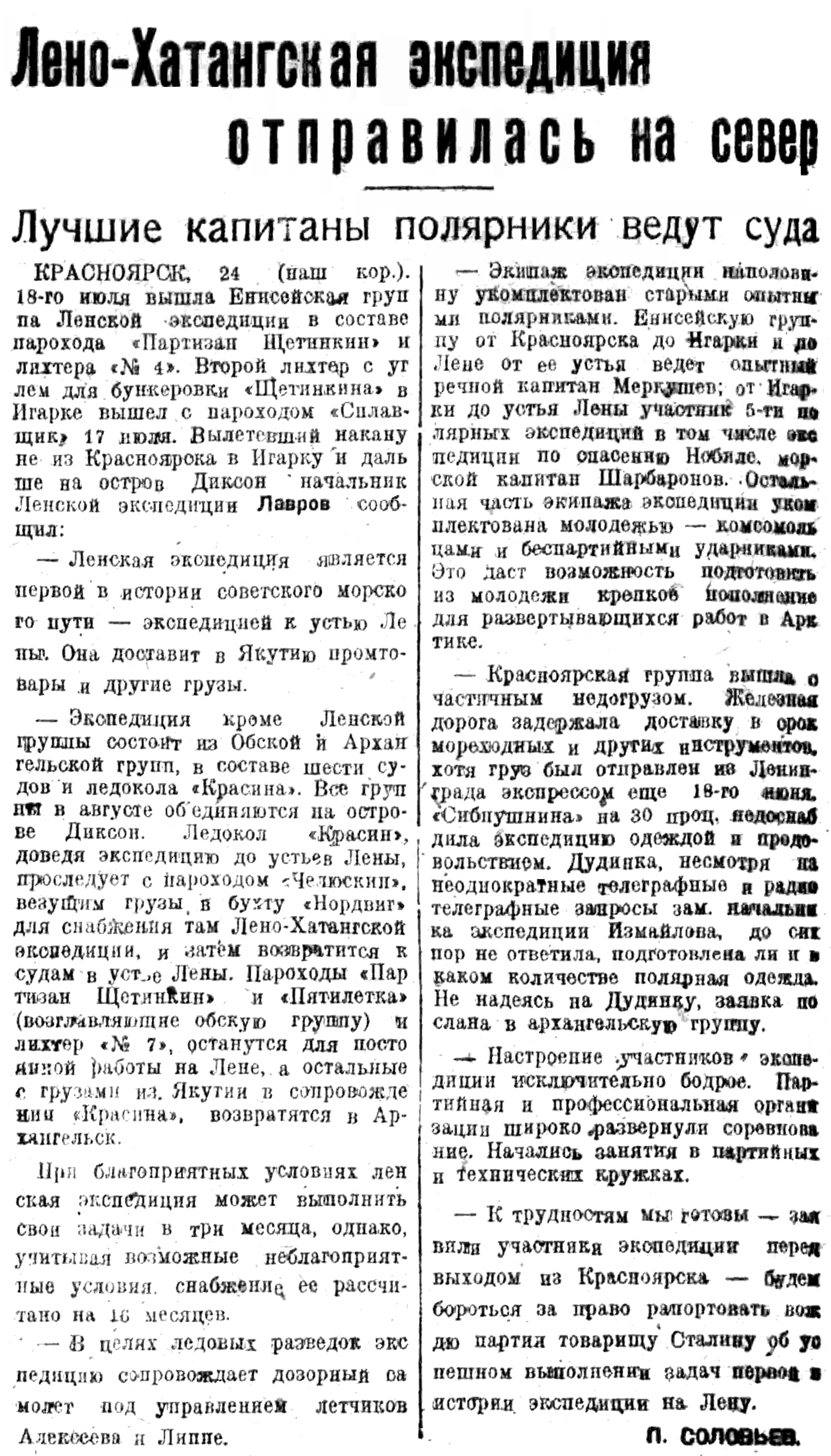 Научно-исследовательская часть Ленской транспортной экспедиции на ледоколе „Красин" состояла из группы сотрудников Арктического института и сотрудников Центрального Бюро погоды. Гидрологические исследования на ледоколе „Красин" велись гидрологами Л. Л. Балакшиным и И. В. Максимовым, гидрофизиком Б. А. Рябовым, гидрохимиком И. В. Финкельштейн и студентом-практикантом И. И. Подольским. Служба погоды осуществлялась заведующим пловучим бюро Б. Л. Дзердзеевским и синоптиком А. П. Гольцовым. На пароходе „Володарский" в качестве синоптика работала В. А. Самойлова. На пароходе „Первая пятилетка" исследовательские работы выполнялись гидрографом В. В. Вердеревским.