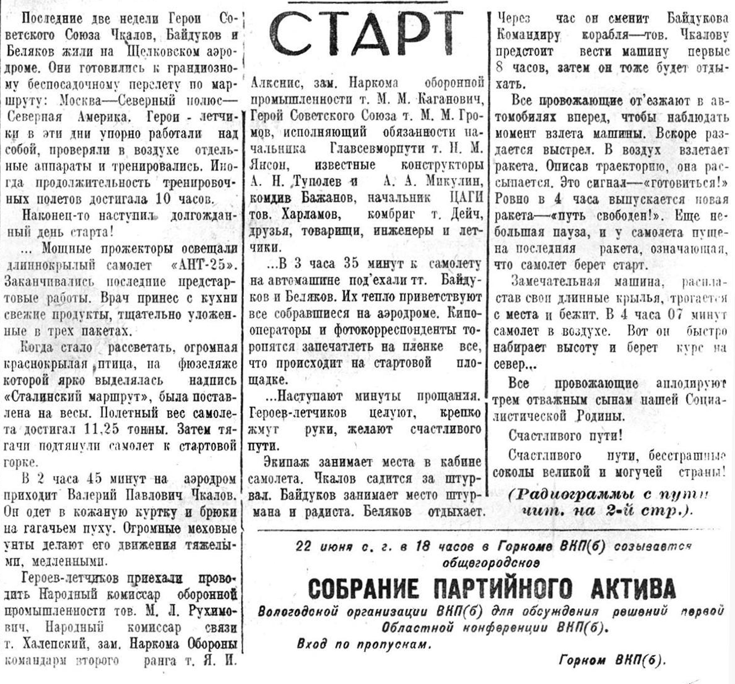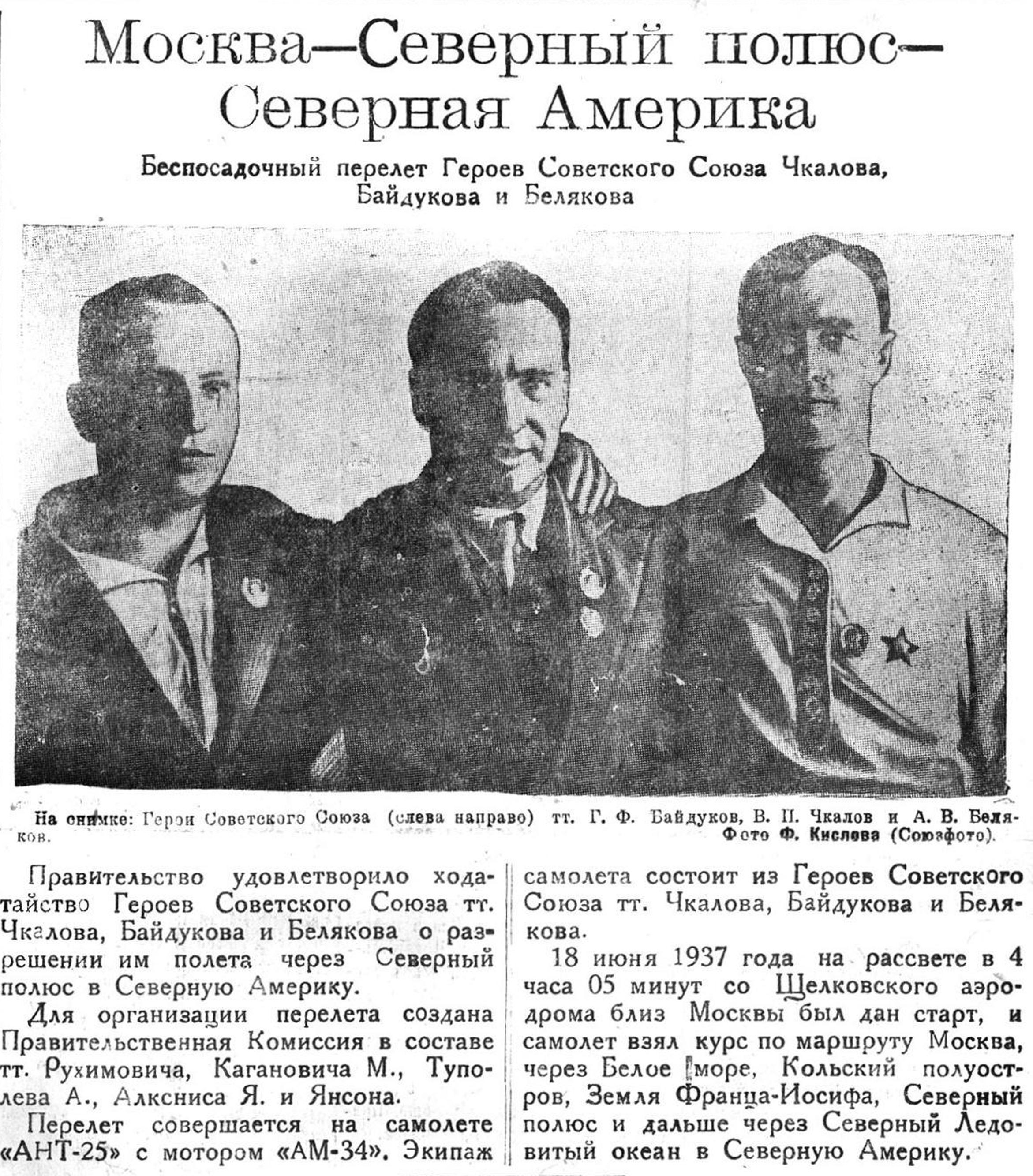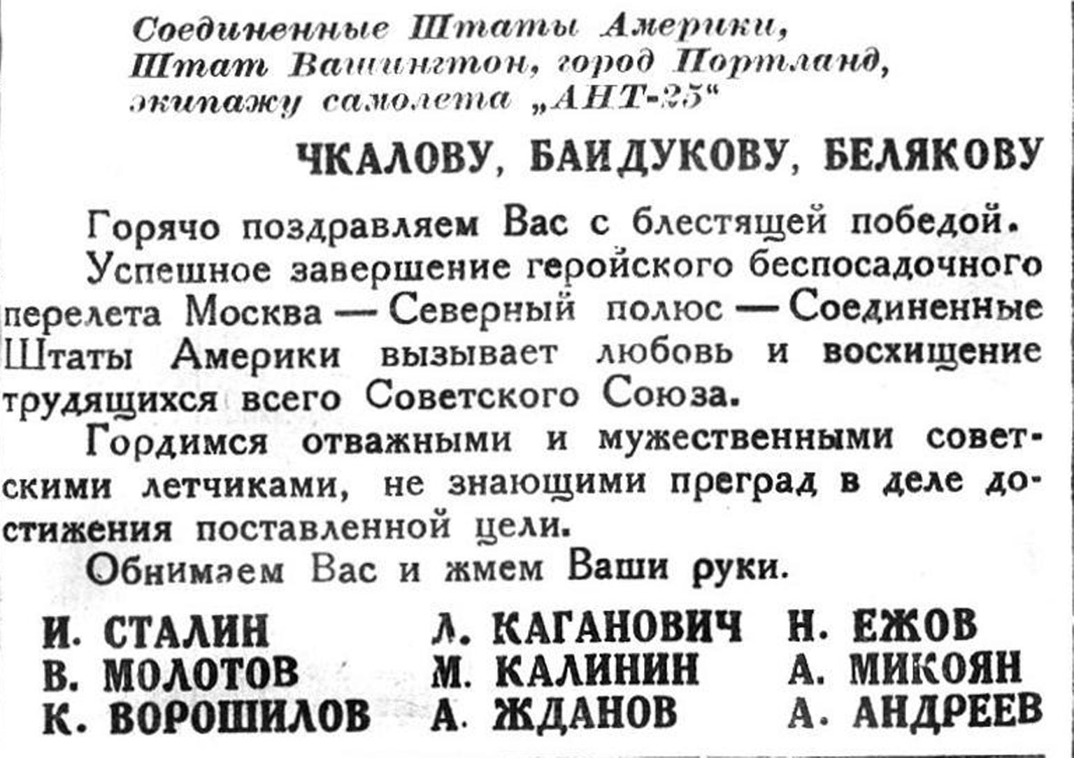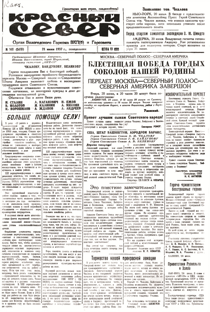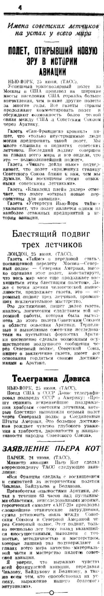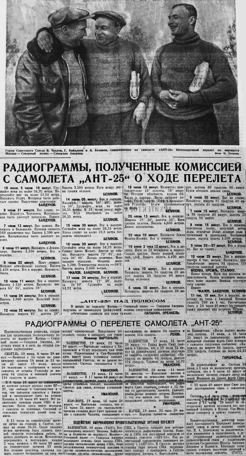 Полет из СССР в Америку через Северный полюс завершает упорную работу, которую Советский Союз ведете течение многих лет по завоеванию Арктики. После того, как нами завоеван Северный полюс и сейчас в нейтральном Полярном бассейне имеется дрейфующая полярная станция во главе с Папаниным, мы имеем возможность широким фронтом вести дальнейшую работу по установлению великого воздушного пути от нашего материка до Америки. В этом отношении полет Чкалова сыграет историческую роль. (ТАСС).