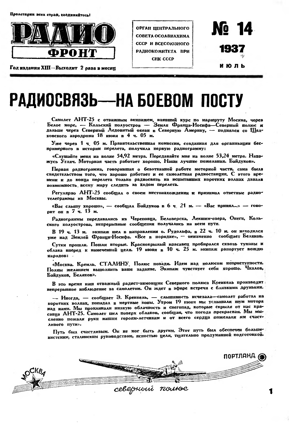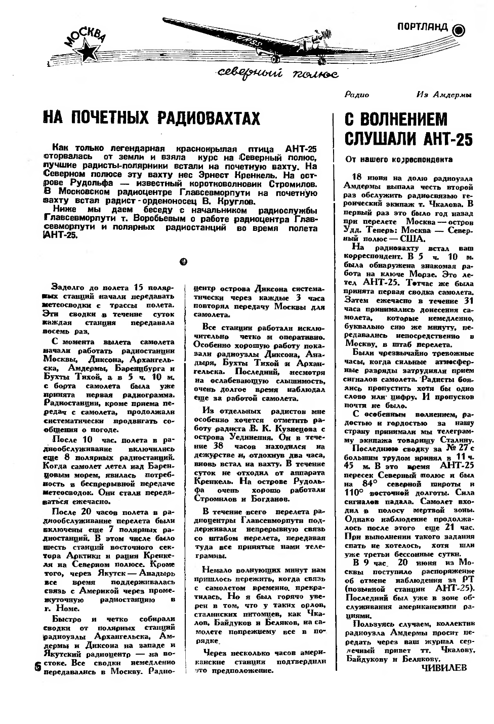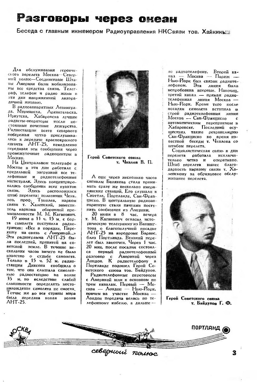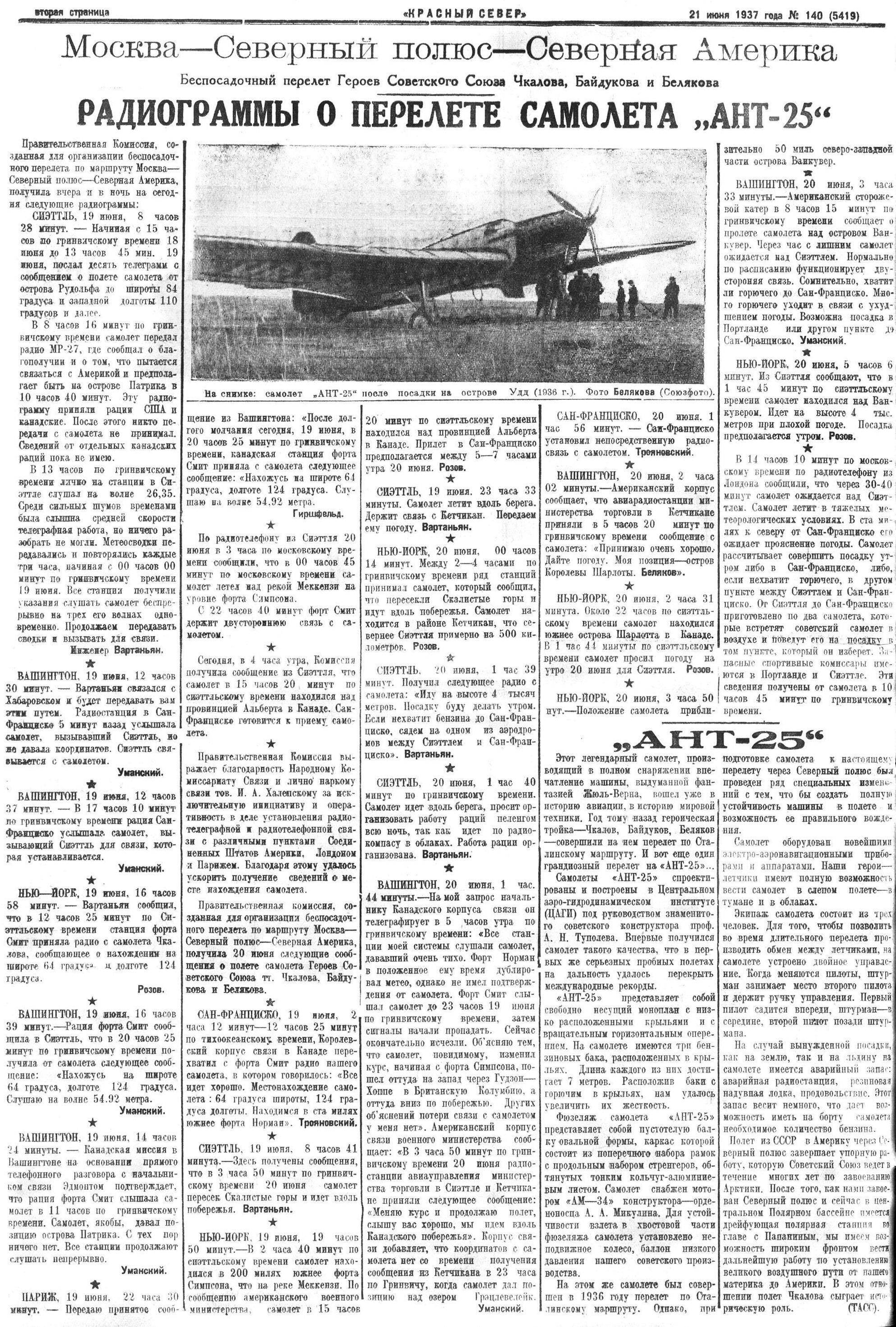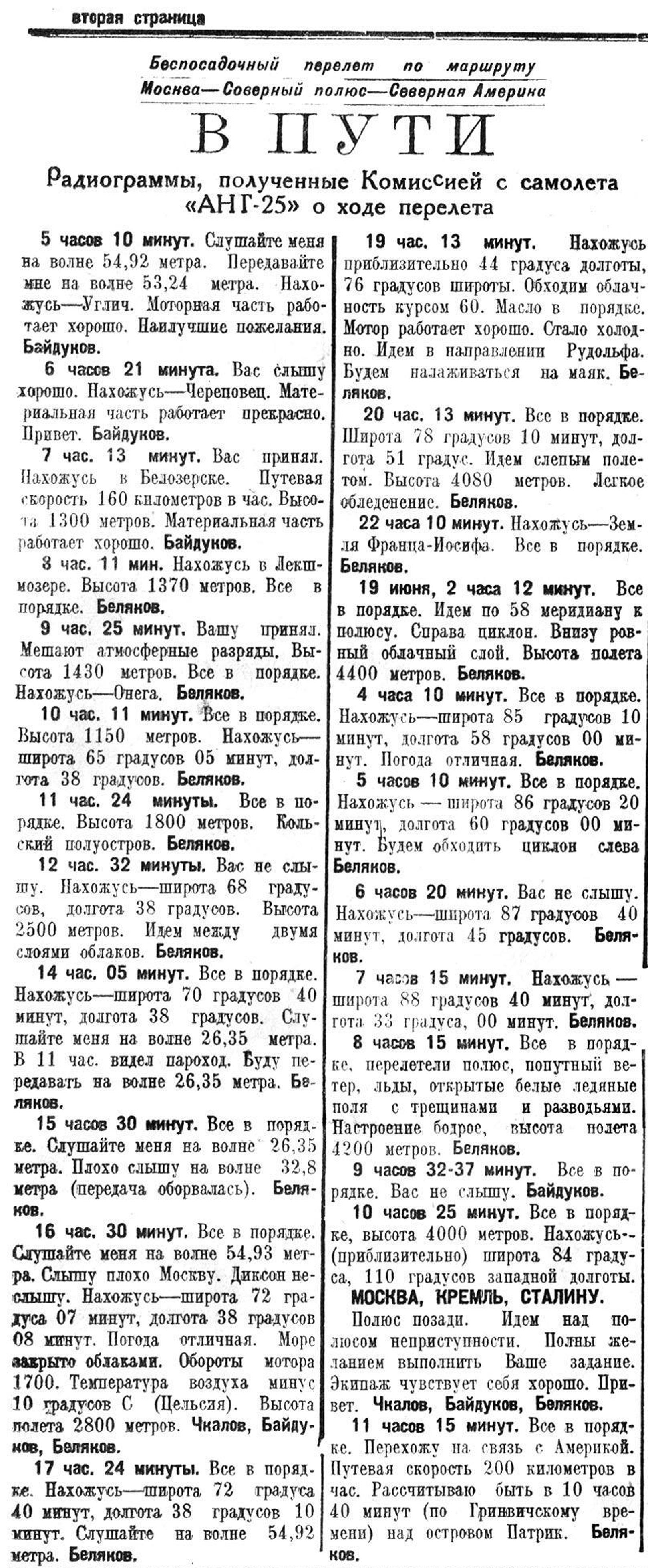Москва—Северный полюс—Северная АмерикаБеспосадочный перелет Героев Советского Союза Чкалова, Байдукова и БеляковаРАДИОГРАММЫ О ПЕРЕЛЕТЕ САМОЛЕТА „АНТ-25“Правительственная Комиссия, созданная для организации беспосадочного перелета по маршруту Москва— Северный полюс—Северная Америка, получила вчера и в ночь на сегодня следующие радиограммы:
