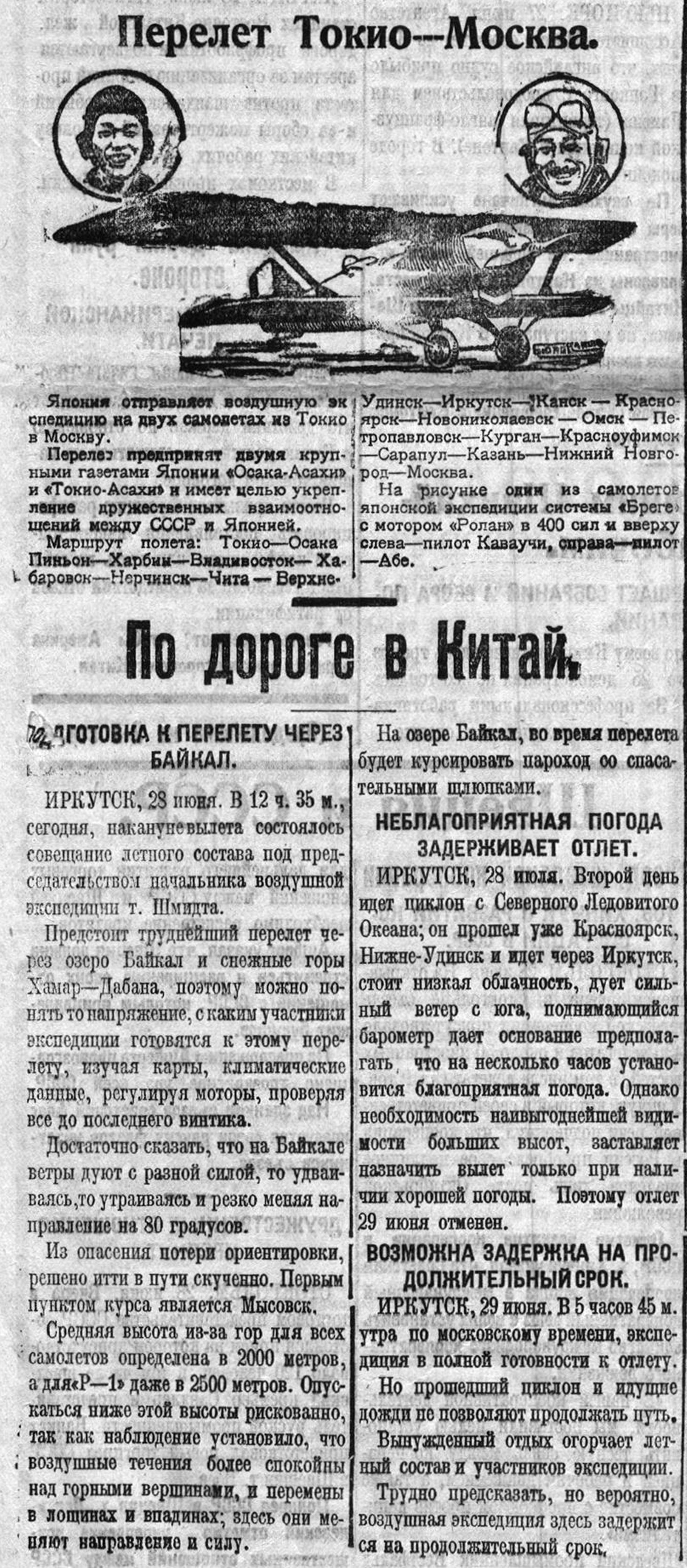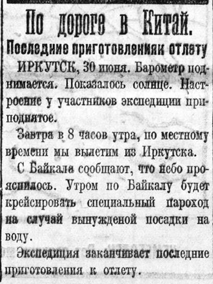 Почтовые бипланы «Р—1», пилотируемые Волковойновым и Громовым, спустившиеся в Верхне-Удинске вылетают отсюда в Ургу 2 июля.