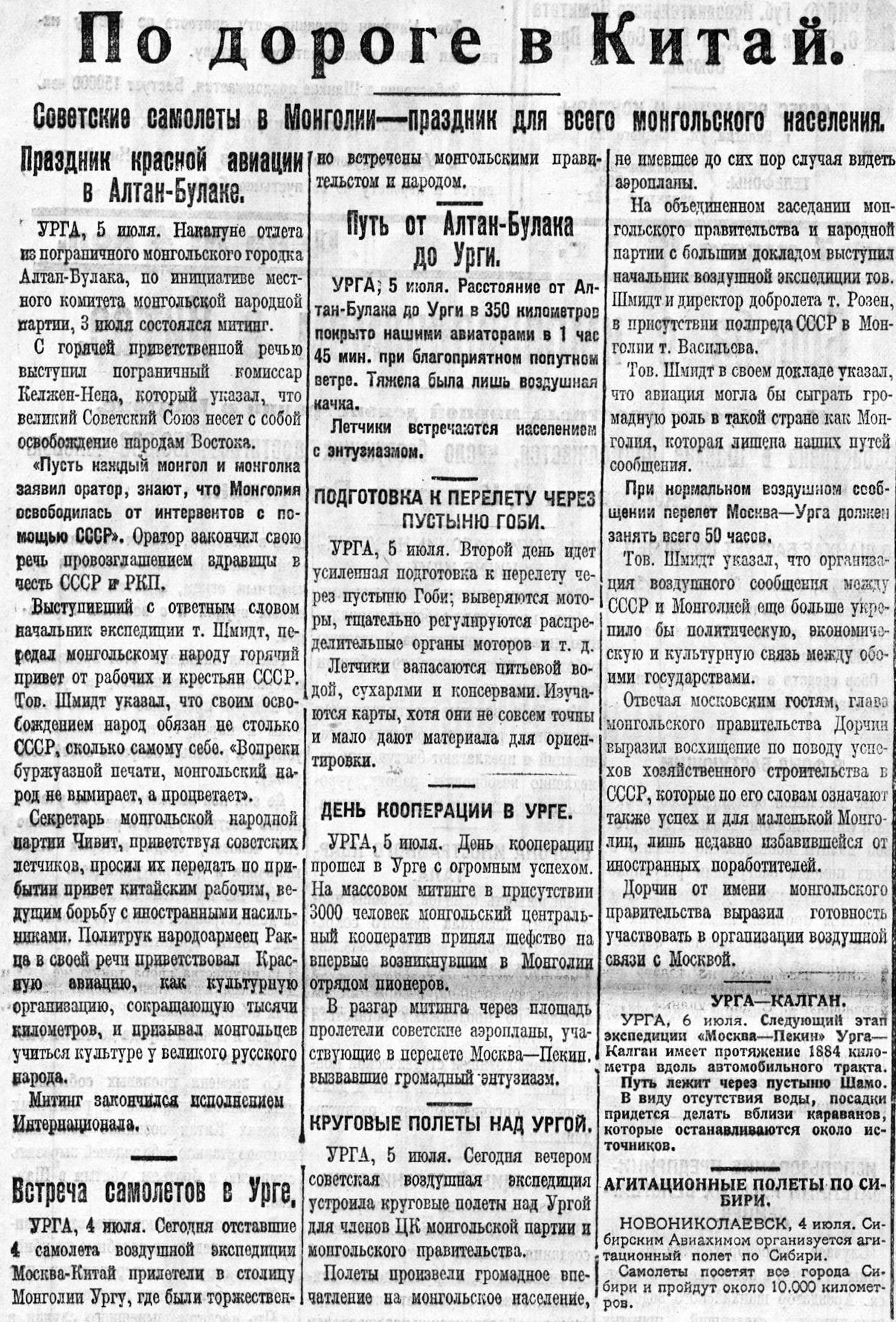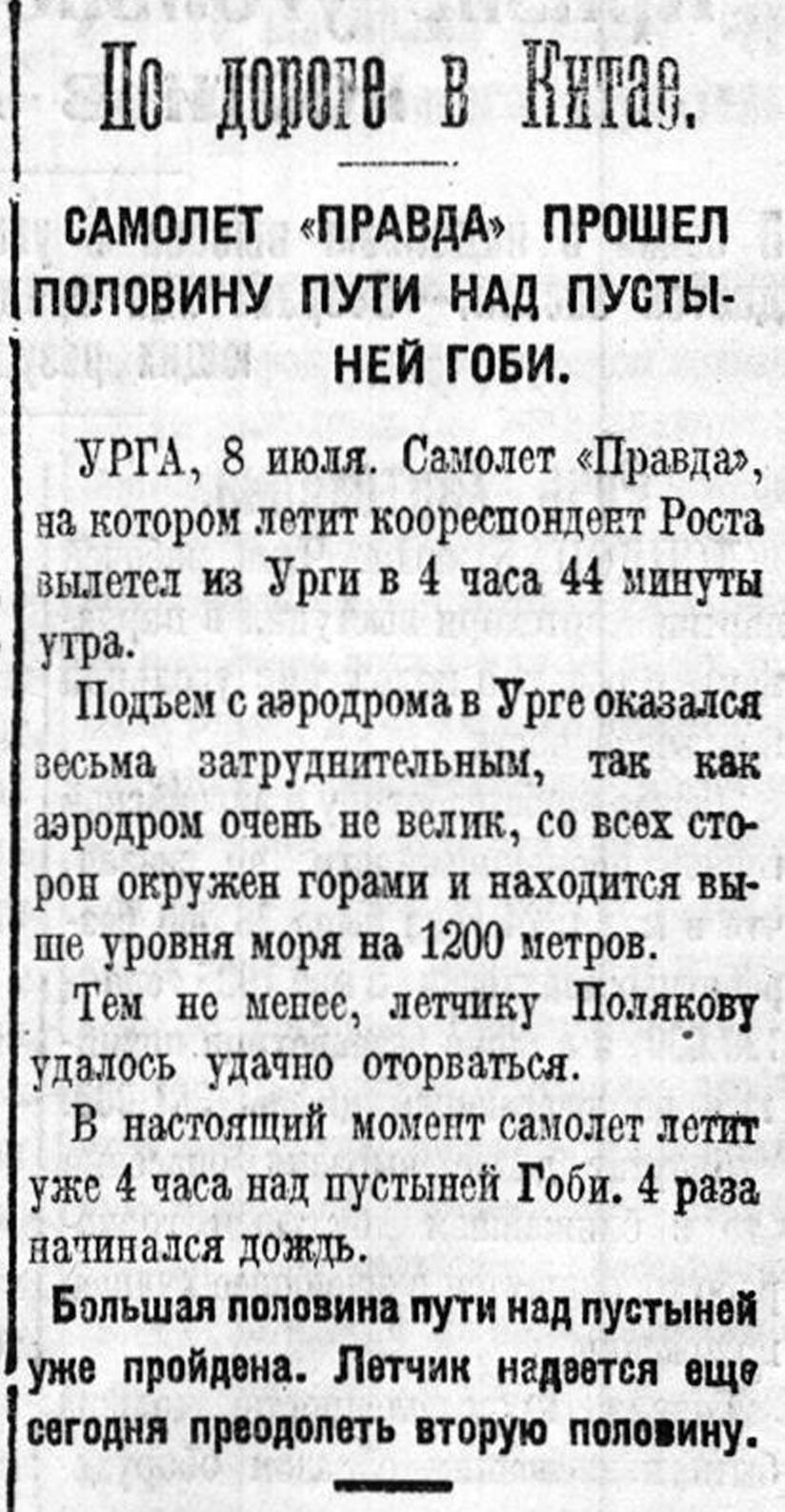 Подъем с аэродрома в Урге оказался весьма затруднительным, ибо аэродром небольшой, со всех сторон окружён горами и находится выше уровня моря на 1200 метров. Однако, летчику Полякову удалось удачно оторваться от земли и ныне самолет летит уже 4 часа над пустыней Гоби. 4 раза начинали дождь. Большая половина пути над пустыней уже пройдена. Летчик надеется еще сегодня преодолеть вторую половину.