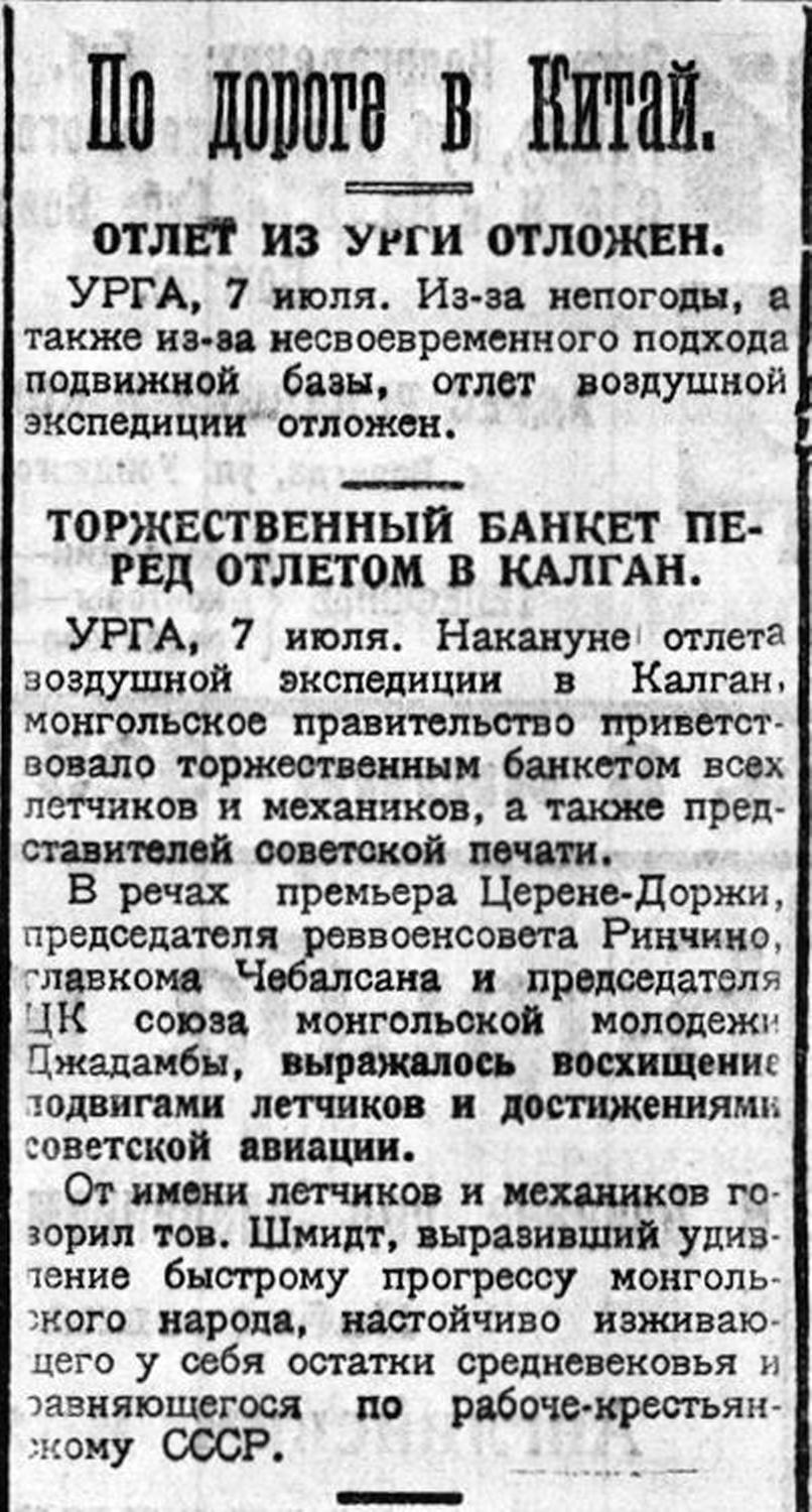 УРГА, 7 июля. Накануне отлета воздушной экспедиции в Калган, монгольское правительство приветствовало торжественным банкетом всех летчиков и механиков, а также представителей советской печати. В речах премьера Церене-Доржи, председателя реввоенсовета Ринчино, главкома Чебалсана и председателя ЦК союза монгольской молодёжи Цжадамбы, выражалось восхищение подвигами летчиков и достижениями советской авиации. От имени летчиков и механиков говорил тов. Шмидт, выразивший удивление быстрому прогрессу монгольского народа, настойчиво изживающего у себя остатки средневековья и равняющегося по рабоче-крестьянскому СССР.