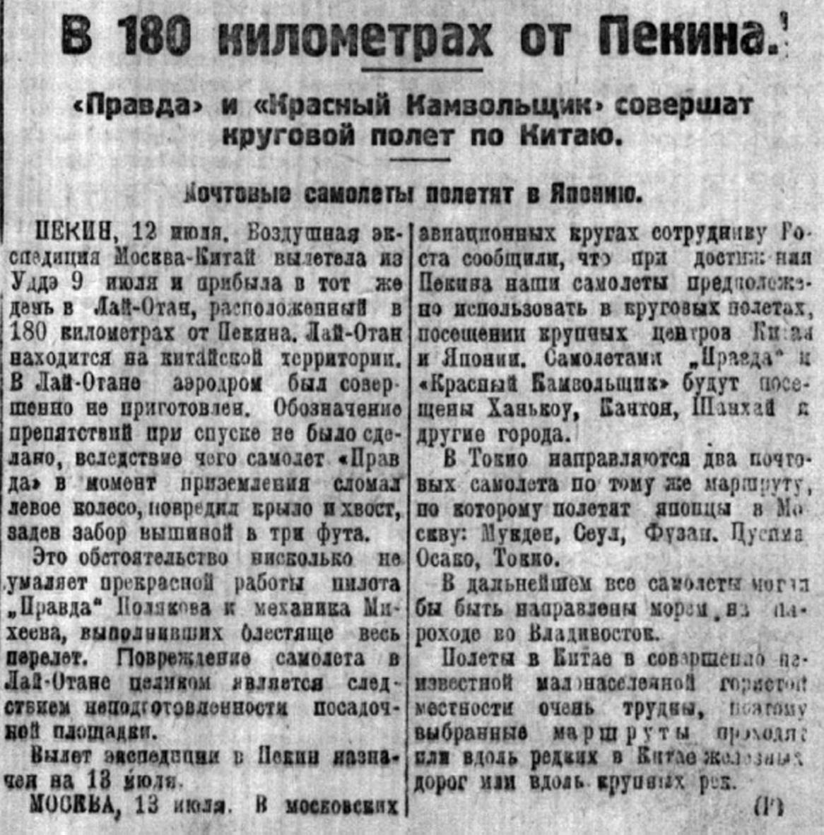 ПЕКИН, 12 июля. Воздушная экспедиция Москва-Китай вылетела из Уддэ 9 июля и прибыла в тот же день в Лай-Отан, расположенный в 180 километрах от Пекина. Лай-Отан находится на китайской территории, В Лай-Отане аэродром был совершенно не приготовлен. Обозначение препятствий при спуске не было сделано, вследствие чего самолет «Правда» в момент приземления сломах левое колесо, повредил срыло и хвост, задев забор выемной в три фута.