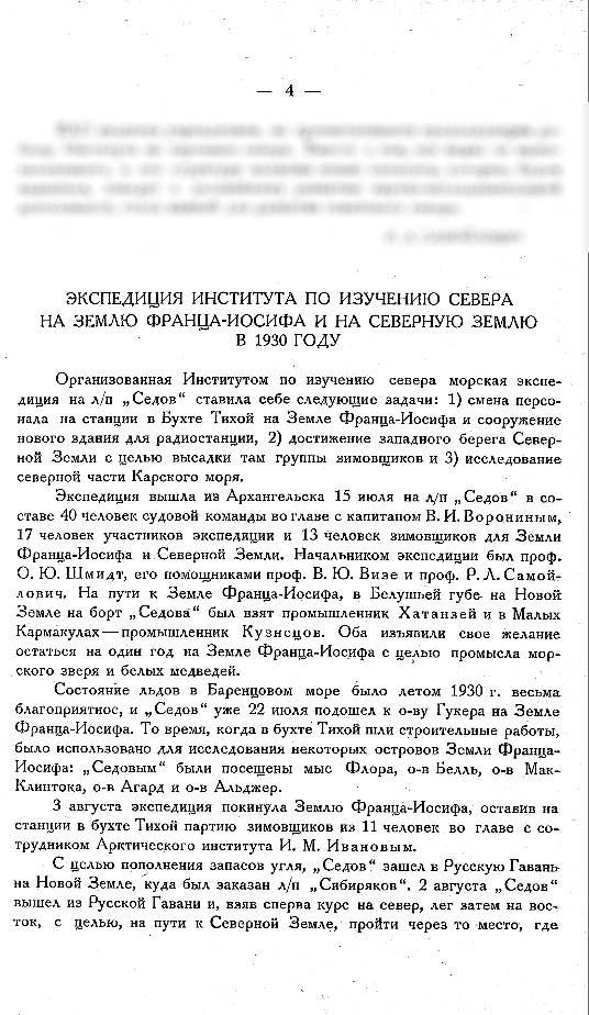 Организованная Институтом по изучению севера морская экспедиция на л/п „Седов" ставила себе следующие задачи: 1) смена персонала на станции в Бухте Тихой на Земле Франца-Иосифа и сооружение нового здания для радиостанции, 2) достижение западного берега Север¬ной Земли с целью высадки там группы зимовщиков и 3) исследование северной части Карского моря.