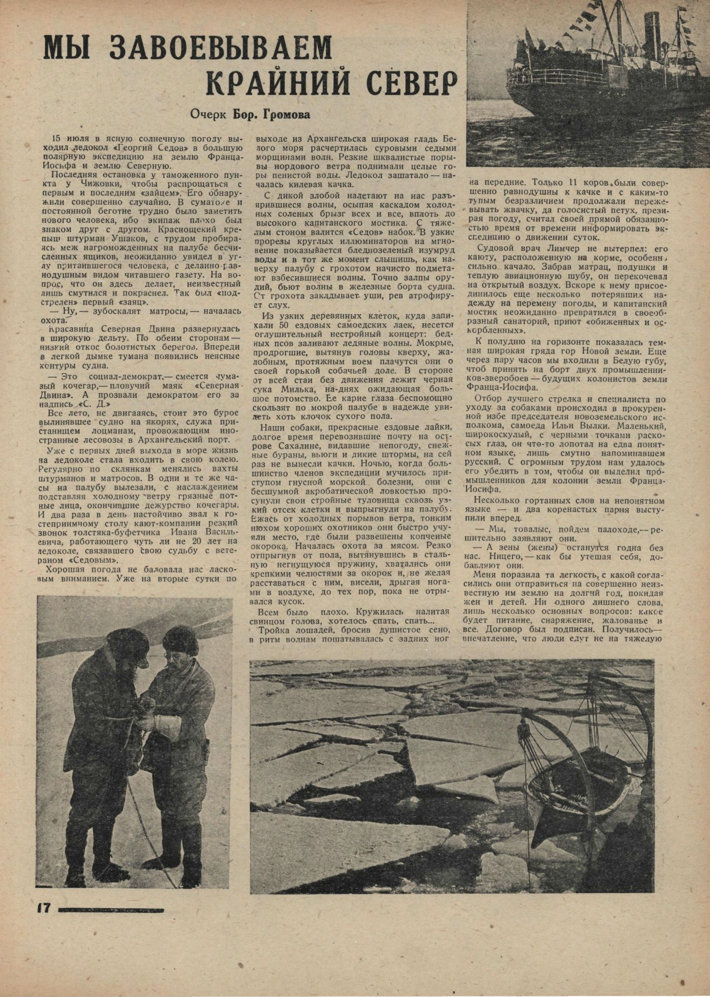 На ледоколе "Седов", как известно, предпринята большая арктическая экспедиция советских ученых к земле Франца Иосифа и оттуда, новым еще неиспробованным путем, к Земле Северной на Ледовитом океане.