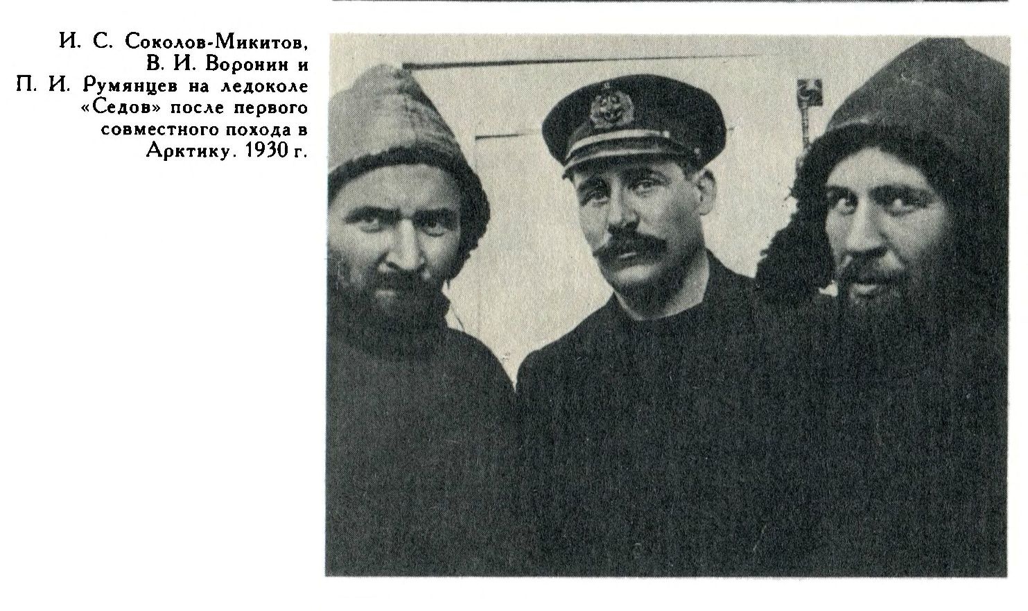 Экспедиция вышла из Архангельска 15 июля на л/п „Седов" в составе 40 человек судовой команды во глазе с капитаном В. И. Ворониным, 17 человек участников экспедиции и 13 человек зимовщиков для Земли Франца-Иосифа и Северной Земли. Начальником экспедиции был проф. О. Ю. Шмидт, его помощниками проф. В. Ю. Визе и проф. Р. Л. Самойлович. На пути к Земле Франца-Иосифа, в Белушьей губе- на Новой Земле на борт „Седова" был взят промышленник Хатанзей и в Малых Кармакулах— промышленник Кузнецов. Оба изъявили свое желание, остаться на один год на Земле Франца-Иосифа с целью промысла мор¬ского зверя и белых медведей.
