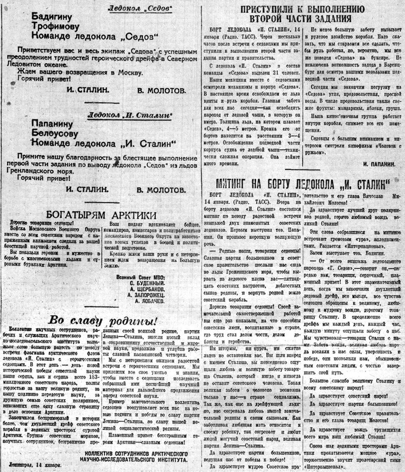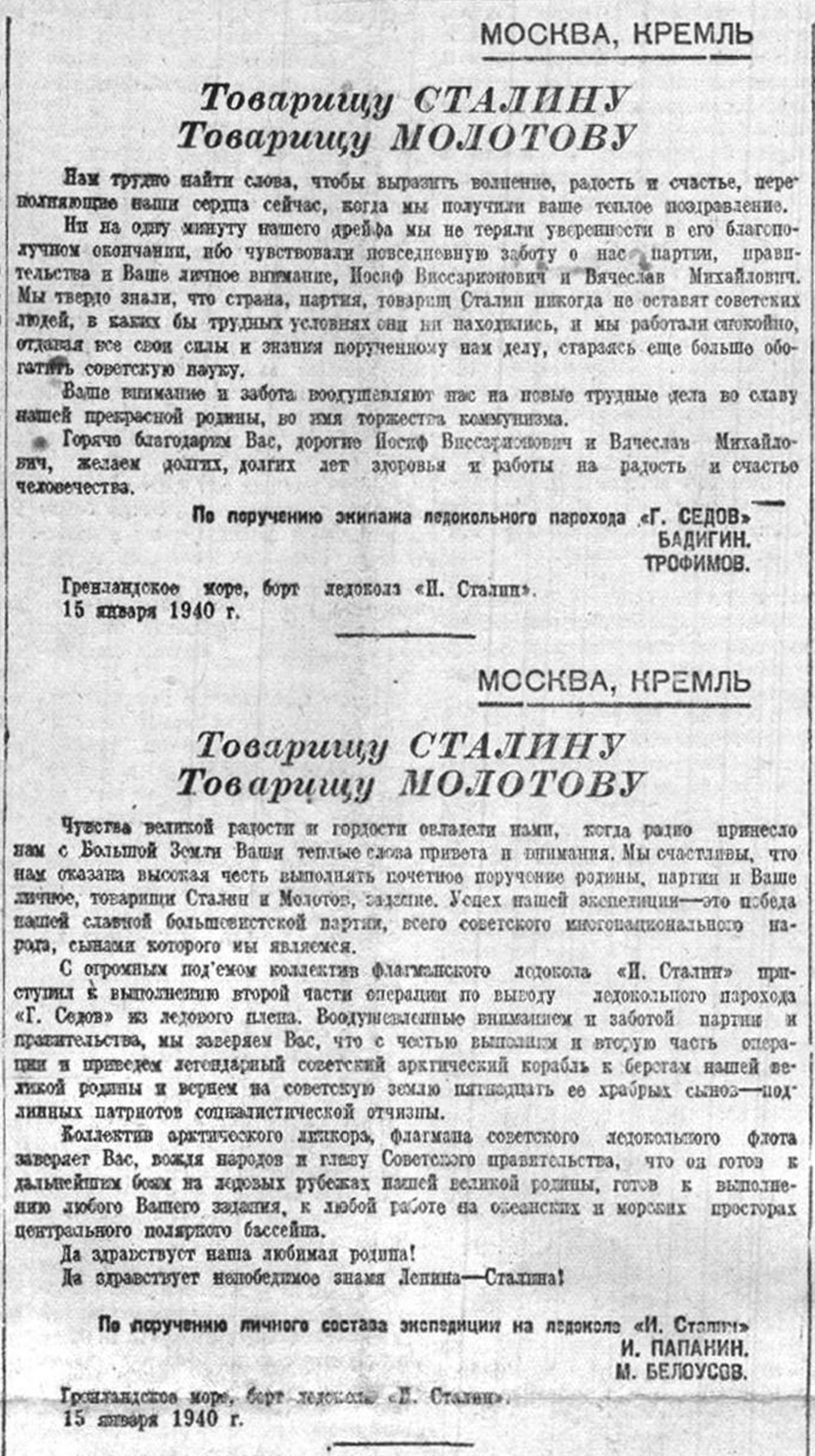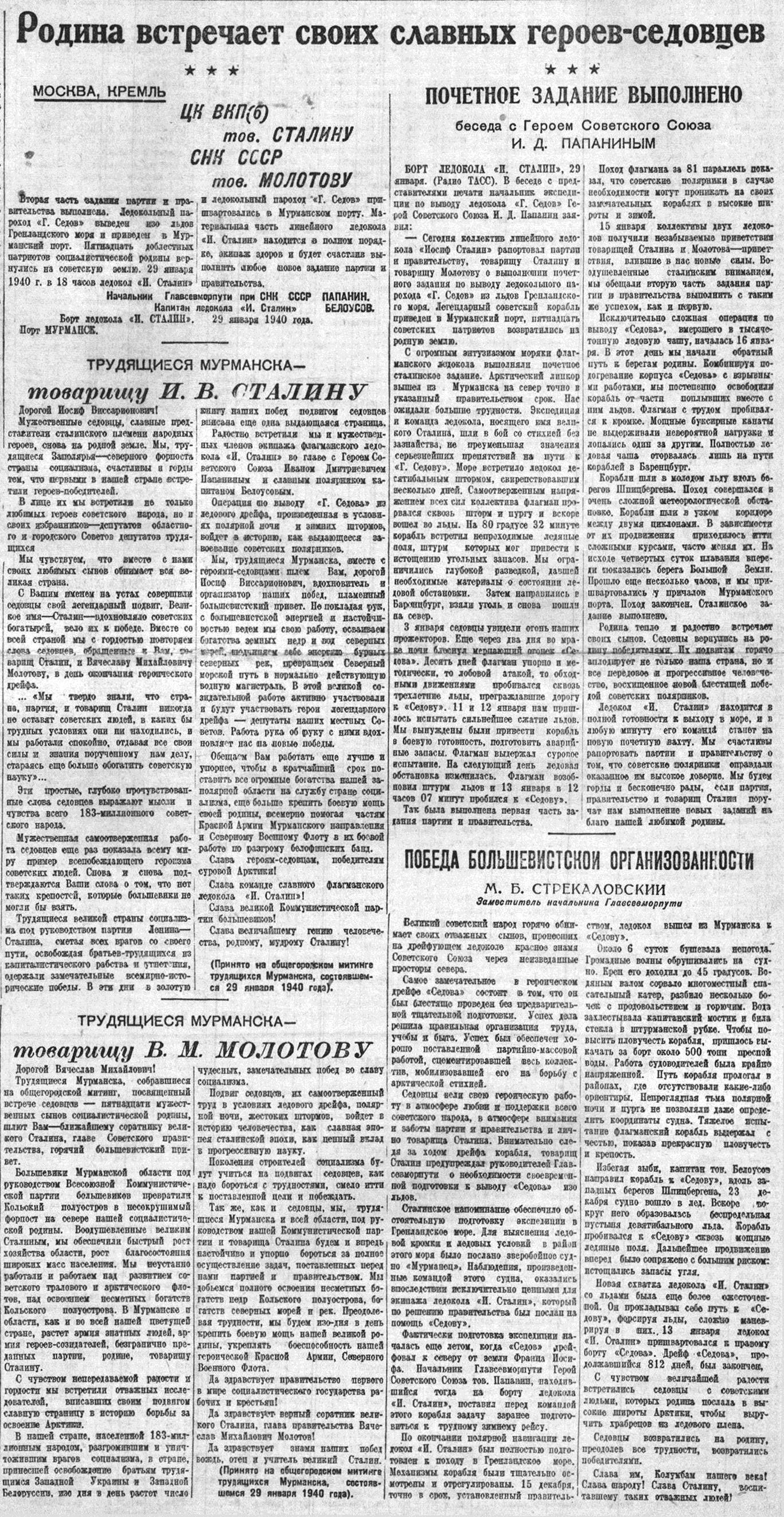 С Вашим именем на устах совершили седовцы свой легендарный подвиг. Великое имя — Сталин — вдохновляло советских богатырей, вело их к победе. Вместе со всей страной мы с гордостью повторяем слова седовцев, обращенные к Вам, товарищ Сталин, и Вячеславу Михайловичу Молотову, в день окончания героического дрейфа.