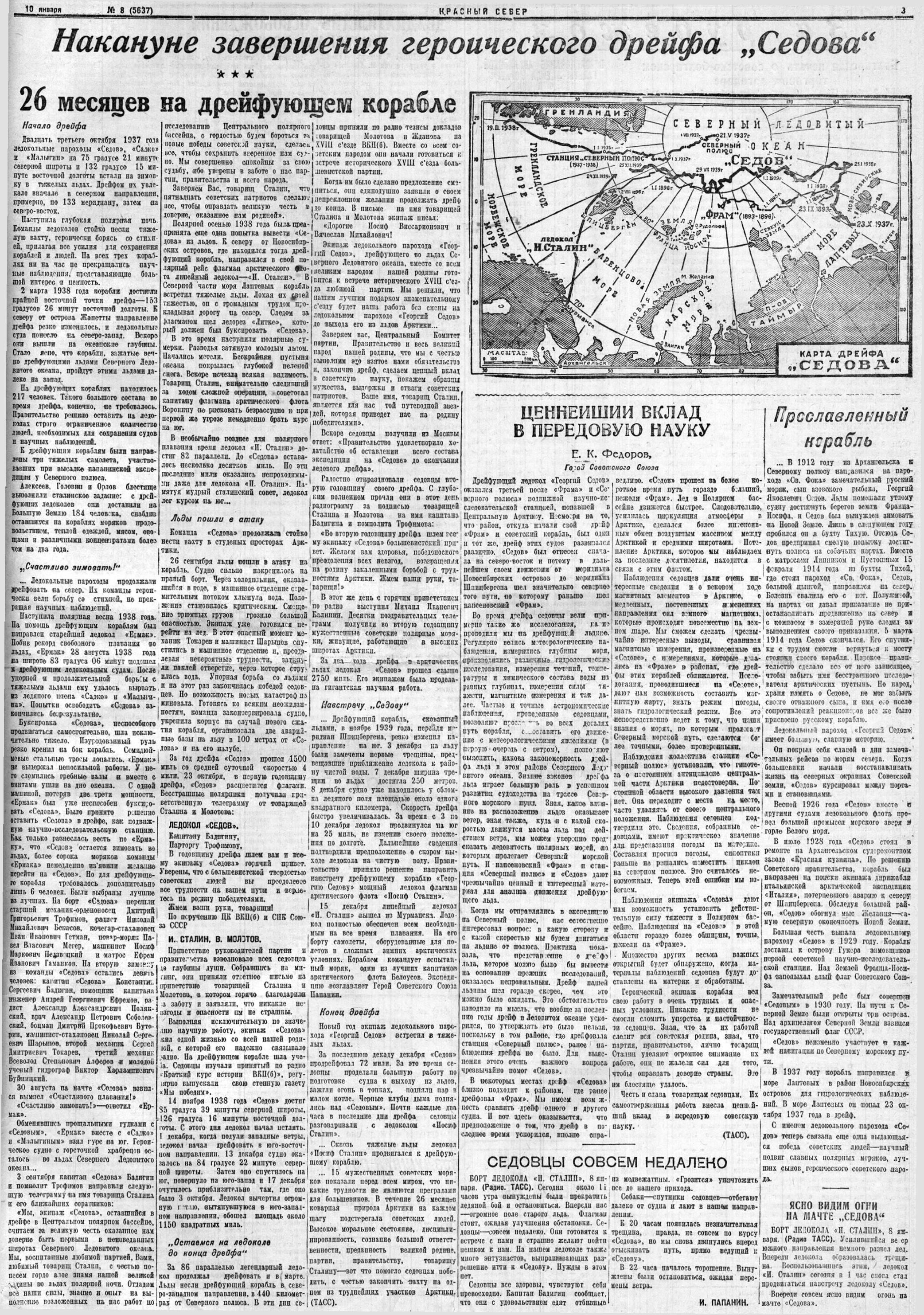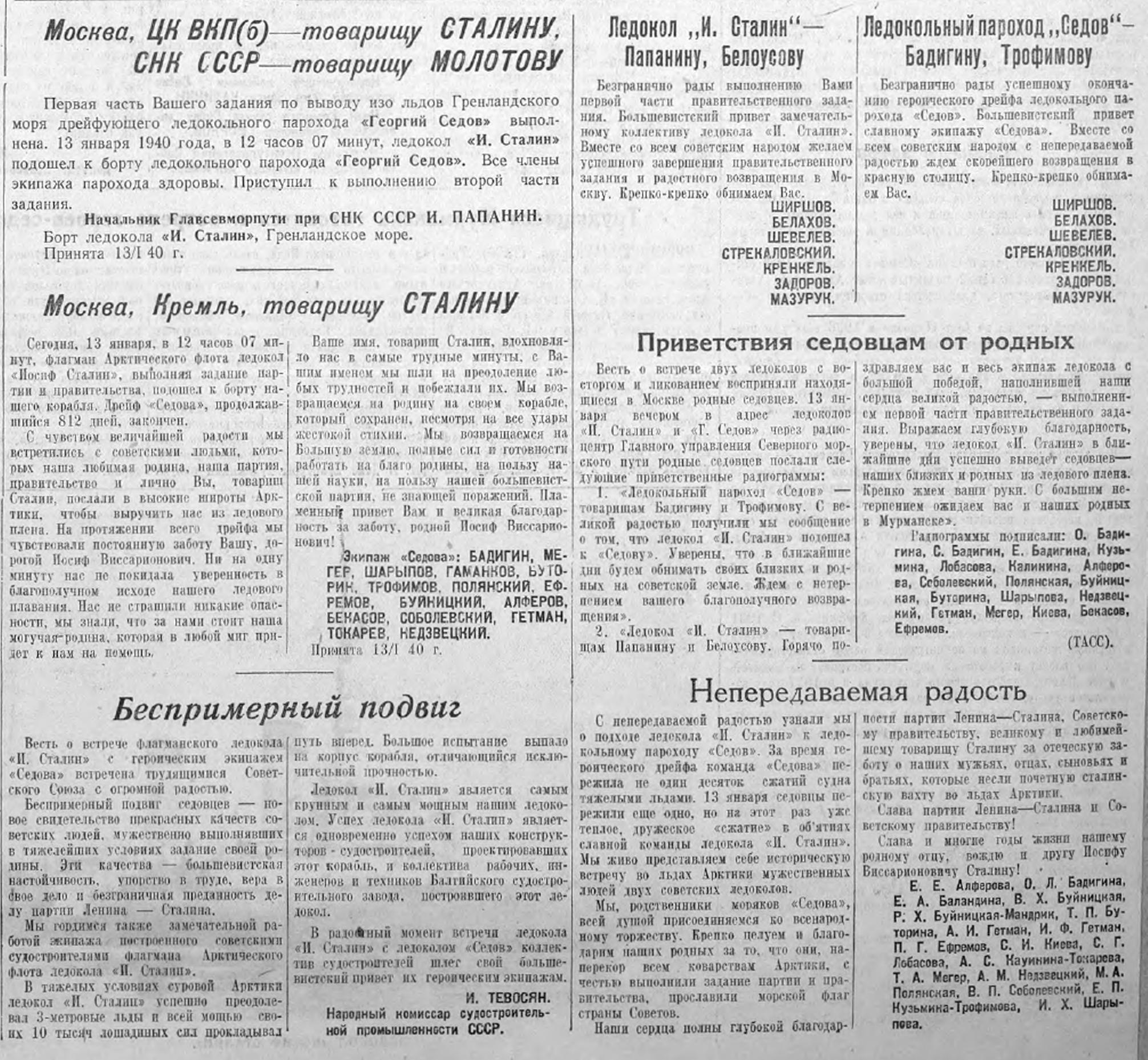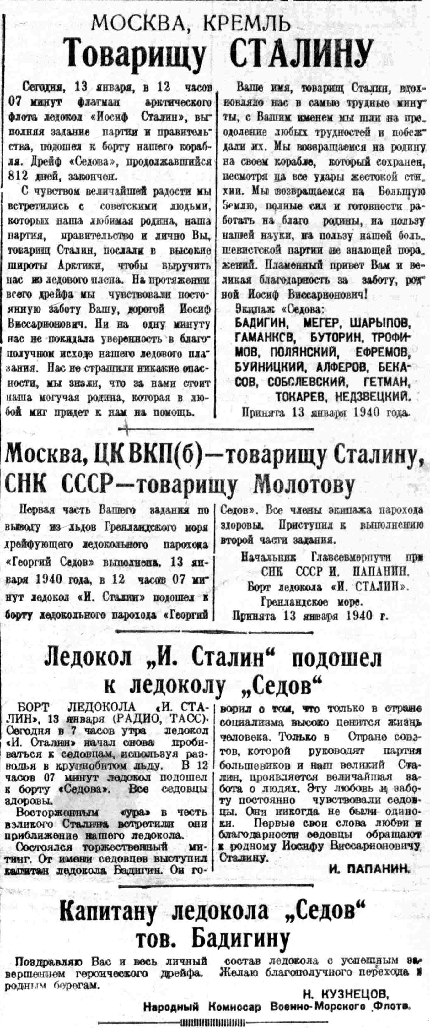 С Вашим именем на устах совершили седовцы свой легендарный подвиг. Великое имя — Сталин — вдохновляло советских богатырей, вело их к победе. Вместе со всей страной мы с гордостью повторяем слова седовцев, обращенные к Вам, товарищ Сталин, и Вячеславу Михайловичу Молотову, в день окончания героического дрейфа.