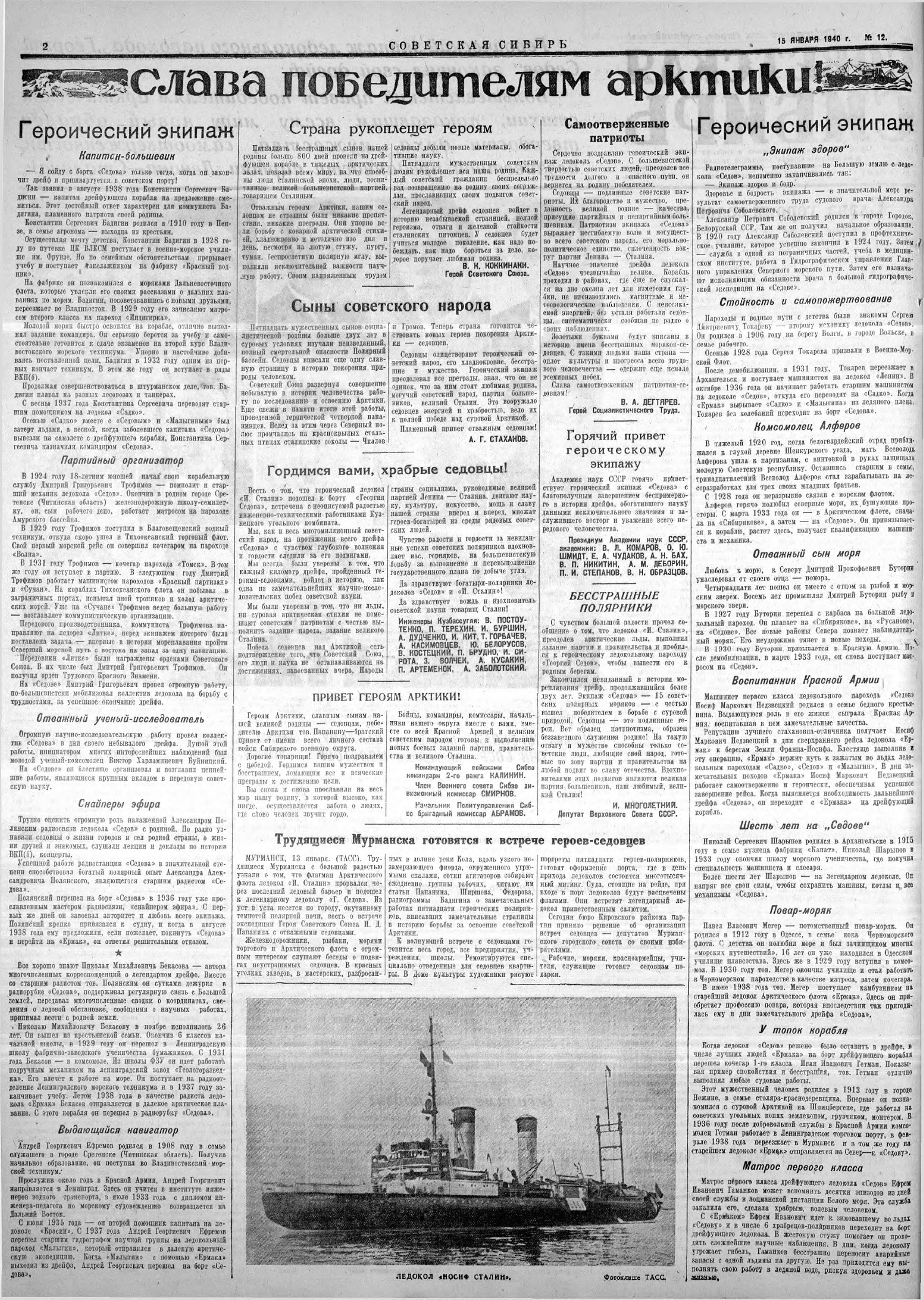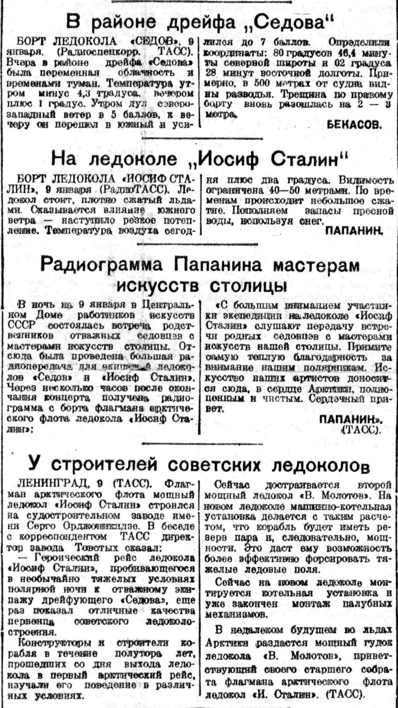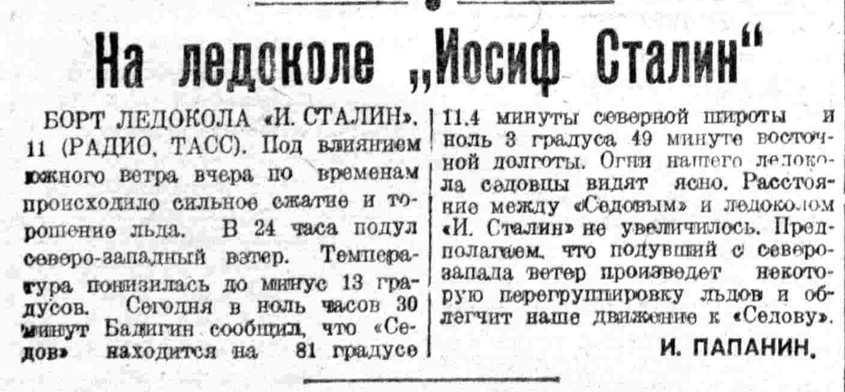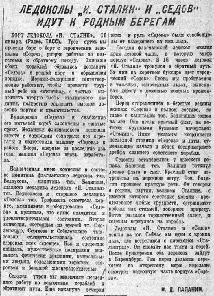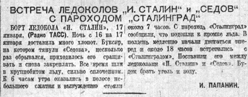 — Героический рейс ледокола «Иосиф Сталин», пробивающегося в необычайно тяжелых условиях полярной ночи к отважному экипажу дрейфующего «Седова», еще раз показал отличные качества первенца советского ледоколостроения.