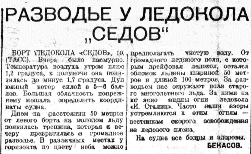 БОРТ ЛЕДОКОЛА «И. СТАЛИН». 11 (РАДИО, ТАСС). Под влияниям южного ветра вчера по временам происходило сильное сжатие и торошение льда. В 24 часа подул северо-западный ветер. Температура понизилась до минус 13 градусов. Сегодня в ноль часов 30 минут Бадигин сообщил, что «Седов» находится на 81 градусе 11.4 минуты северной широты и ноль 3 градуса 49 минуте восточной долготы. Огни нашего ледокола седовцы видят ясно. Расстояние между «Седовым» и ледоколом «И. Сталин» не увеличилось. Предполагаем, что подувший с северо-запада ветер произведет некоторую перегруппировку льдов и облегчит наше движение к «Седову».
