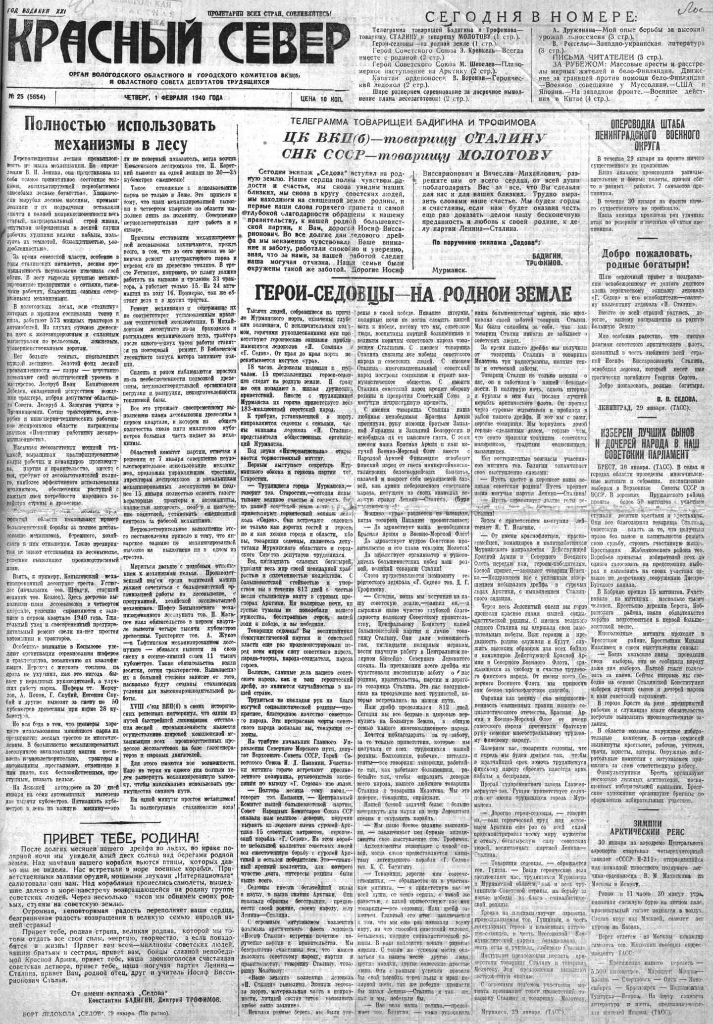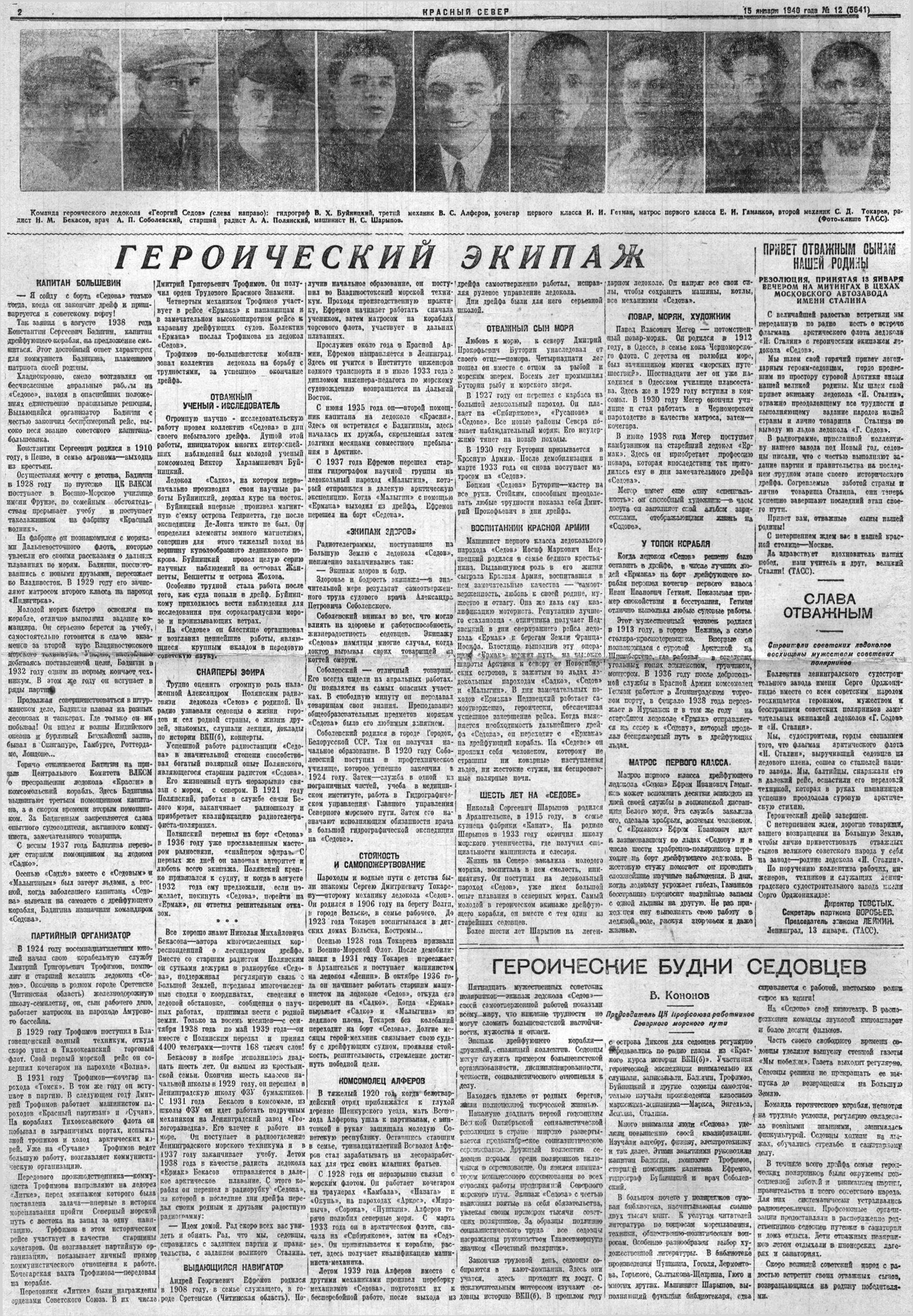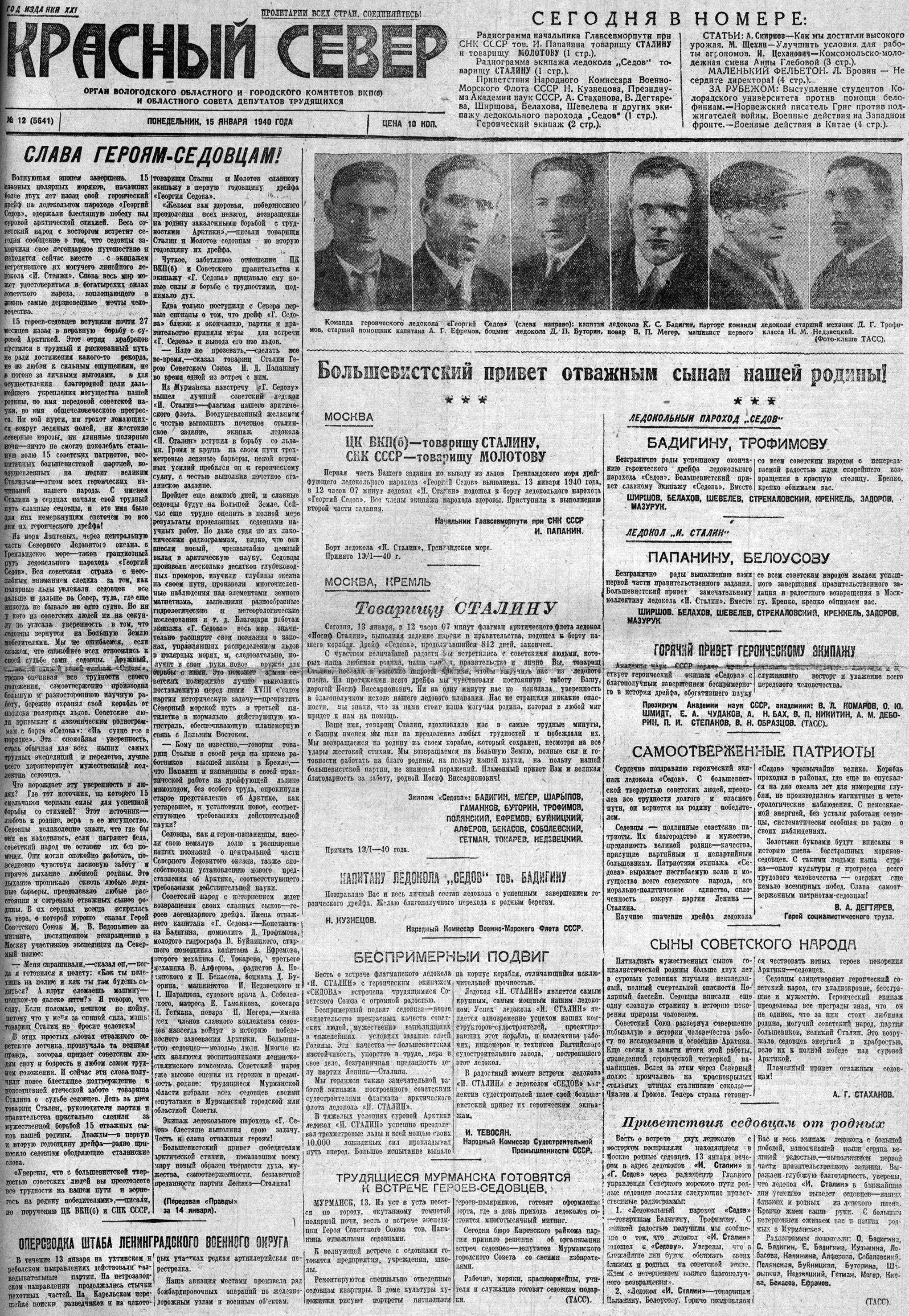 Так же, как и седовцы, мы, трудящиеся Мурманска и всей области, под руководством нашей Коммунистической партии и товарища Сталина будем и впредь настойчиво и упорно бороться за полное осуществление задач, поставленных перед нами партией и правительством. Мы добьемся полного освоения несметных богатств недр Кольского полуострова, богатств северных морей и рек. Преодолевая трудности, мы будем изо-дня в день крепить боевую нощь нашей великой родины, укреплять боеспособность нашей героической Красной Армии, Северного Военного Флота.