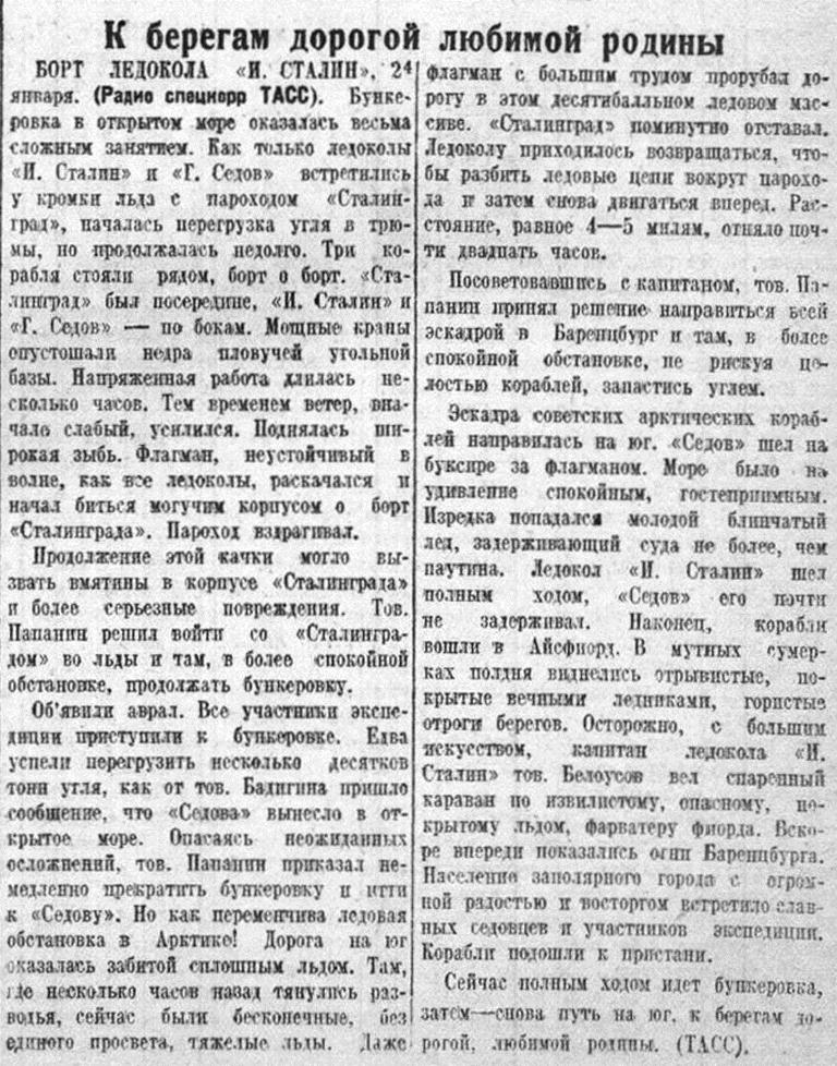 — Сегодня коллектив линейного ледокола «Иосиф Сталин» рапортовал партии и правительству, товарищу Сталину и товарищу Молотову о выполнении почетного задания по выводу ледокольного парохода «Г. Седов» из льдов Гренландского моря. Легендарный советский корабль приведен в Мурманский порт, пятнадцать советских патриотов возвратились на родную землю.