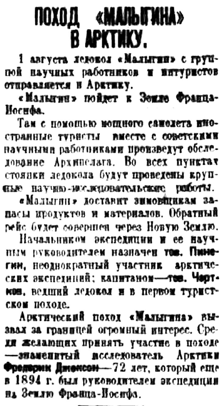 Начальником экспедиции и ее научным руководителей назначен т. Пинегин, неоднократный участник арктических экспедиций: капитаном — тов. Чертков, ведший ледокол и в первом туристском походе.