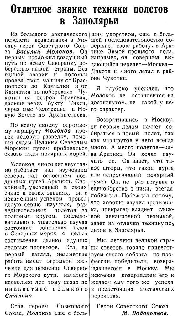 Молоков много лет неустанно работает над изучением севера, над освоением воздушных путей Арктики. Спокойный, уверенный в своих силах и своих знаниях, он с неизменным успехом провел целую серию научных, разведывательных полетов за полярным кругом, последовательно и тщательно изучая состояние движения льдов в Северных морях с целыо составления далеко идущих ледовых прогнозов. Эта, на первый взгляд, незаметная работа имеет огромное значение для освоения Северного Морского пути, начатого несколько лет тому назад по инициативе великого Сталина.