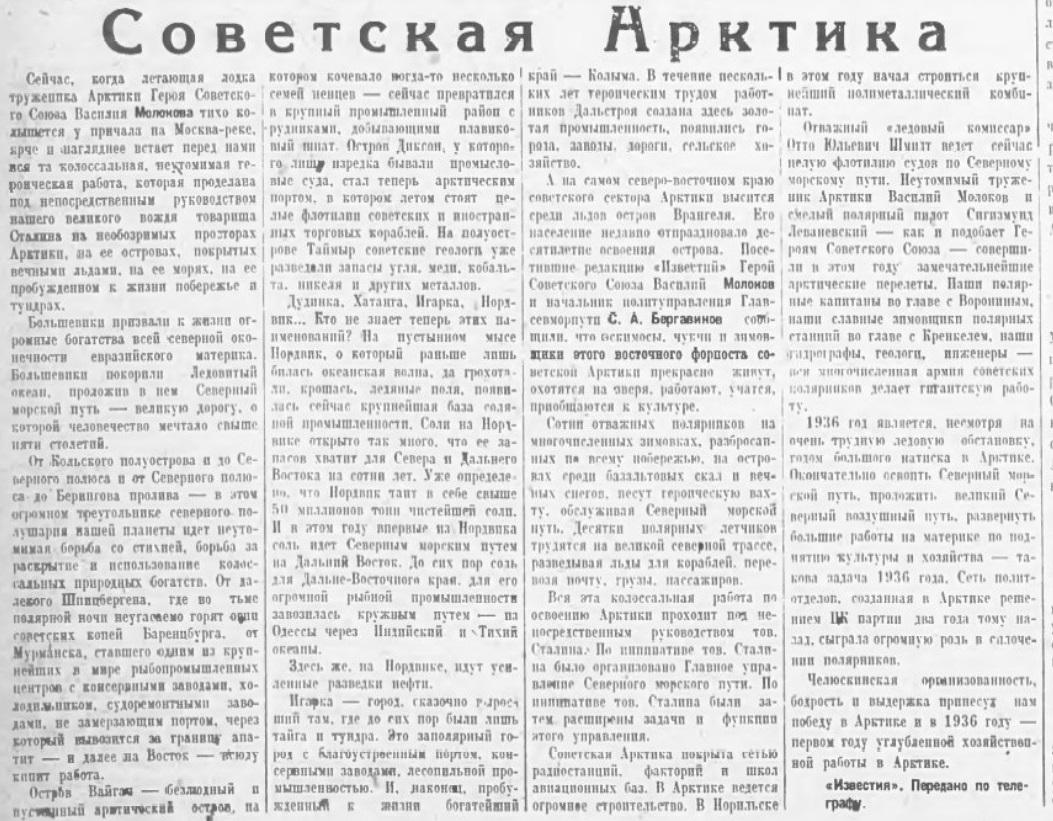 Снова в пути гидросамолет "СССР Н-2", на котором Молоков впервые в истории авиации пролетел по всей трассе великого Северного морского пути, покрыв свыше 26 тысяч километров необъятных просторов суровой Арктики. Вместе с т. Молоковым вылетели первый бортмеханик орденоносец т. Побежимов, штурман орденоносец т. Ритсланд, второй бортмеханик-орденоносец т. Мишенков и жена т. Молокова — Надежда Ивановна.
