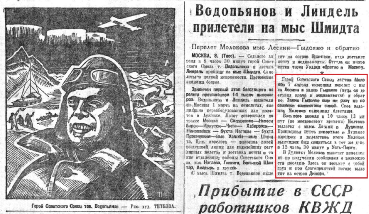 Утром за нами из Игарки прилетел летчик И. И. Черевичный (ставший впоследствии Героем Советского Союза) и доставил весь экипаж в Дудинку. Там нас ожидал летчик П. Г. Головин, который перегнал для нас самолет из Красноярска. Он так спешил, что весь путь в 2100 километров проделал без остановки за световой день. По тому времени это был рекорд. Замечательные у меня были [62] товарищи — смелые, закаленные, прекрасно владевшие летным мастерством, настоящие полярные асы!