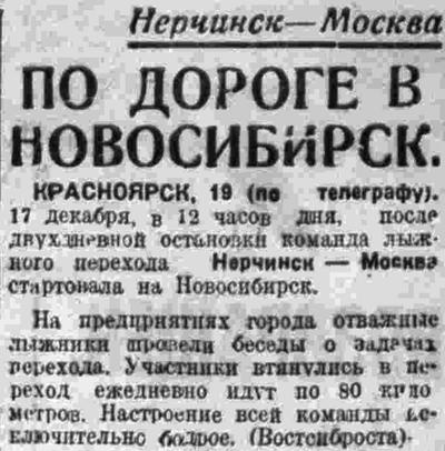 В Красноярске, Ачинске и Тайге нас встречали и провожали физкультурники и представители воинских частей. От Ачинска подул сильный ветер (при 25 градусах мороза), который задерживал движение. Были случаи обмораживания лица и пальцев рук. В Новосибирске будем 26-го декабря, в 12 часов дня.