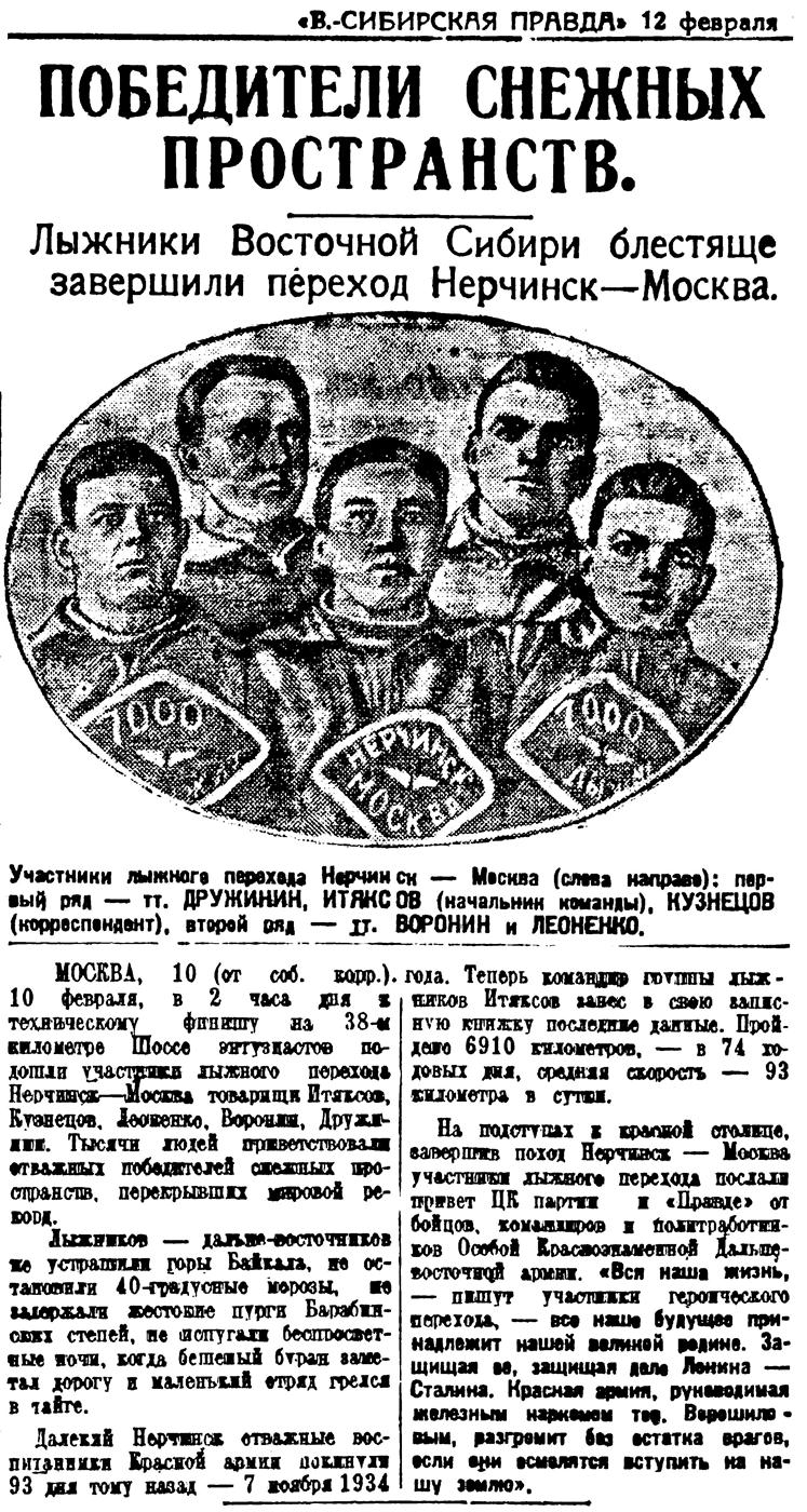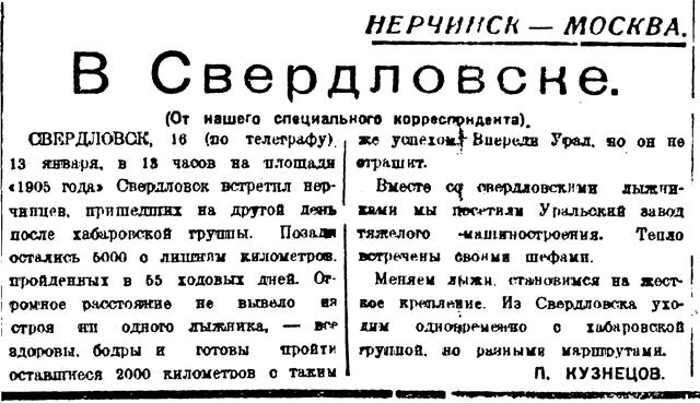 На подступах к красной столице, завершив поход Нерчинск — Москва участники лыжного перехода послали привет ЦК партии и «Правде» от бойцов, командиров и политработников Особой Краснознаменной дальневосточной армии. «Вся наша жизнь, — пишут участники героического перехода, — все наше будущее принадлежит нашей великой родине. Защищая ее, защищая дело Ленина — Сталина, Красная армия, руководимая железным наркомом тов. Ворошиловым, разгромит без остатка врагов, если они осмелятся вступить на нашу землю».