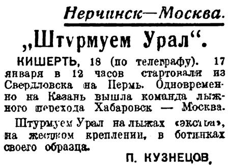 КИШЕРТЬ, 18 (по телеграфу). 17 января в 12 часов стартовали из Свердловска на Пермь. Одновременно на Казань вышла команда лыжного перехода Хабаровск — Москва.