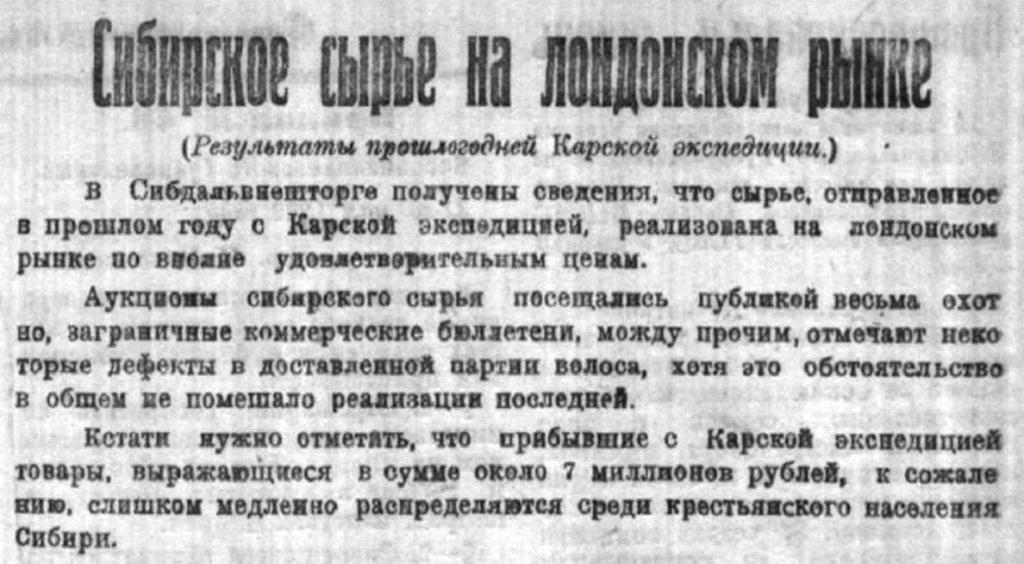 На последнем заседании Сибревкома 23 ноября, представителем Комитета Северного Морского Пути т. Шольцем был сделан представляющий большой интерес информационный доклад о деятельности комитета вообще и в частности о результатах Карской экспедиции текущего года.