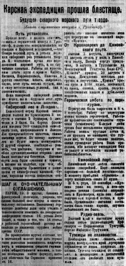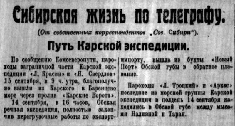 По сообщению Комсеверопути, пароходы заграничной части Карской экспедиции «Л. Красин» и «Я. Свердлов» 15 сентября, в 9 ч. утра, благополучно вышли из Карского в Баренцево море через пролив «Карские Ворота».
