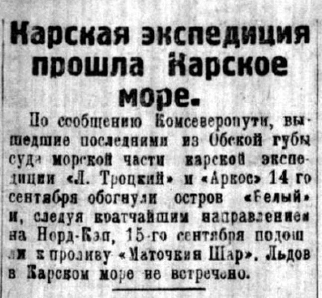 По сообщению Комсеверопути, вышедшие последними из Обской губы суда морской части Карской экспедиции «Л. Троцкий» и «Аркос» 14-го сентября обогнули остров «Белый» и, следуя кратчайшим направлением на Норд-Кап, 15-го сентября подошли к проливу «Маточкин Шар». Льдов в Карском море не встречено.