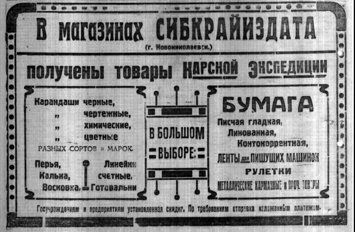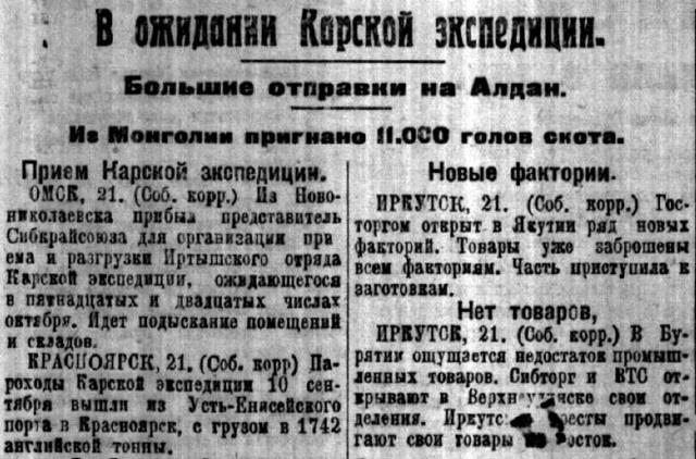 ОМСК, 21. (Соб. корр.) Из Новониколаевска прибыл представитель Сибкрайсоюза для организации приема и разгрузки Иртышского отрада Карской экспедиции, ожидающегося в пятнадцатых и двадцатых числах октября. Идет подыскание помещений и складов.