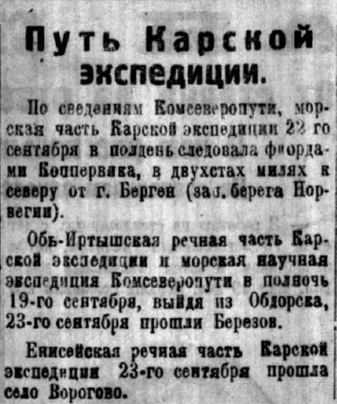 По сведениям Комсеверопути, морская часть Карской экспедиции 22-го сентября в полдень следовала фиордами Коппервика, в двухстах милях к северу от г. Берген (зап. берега Норвегии).