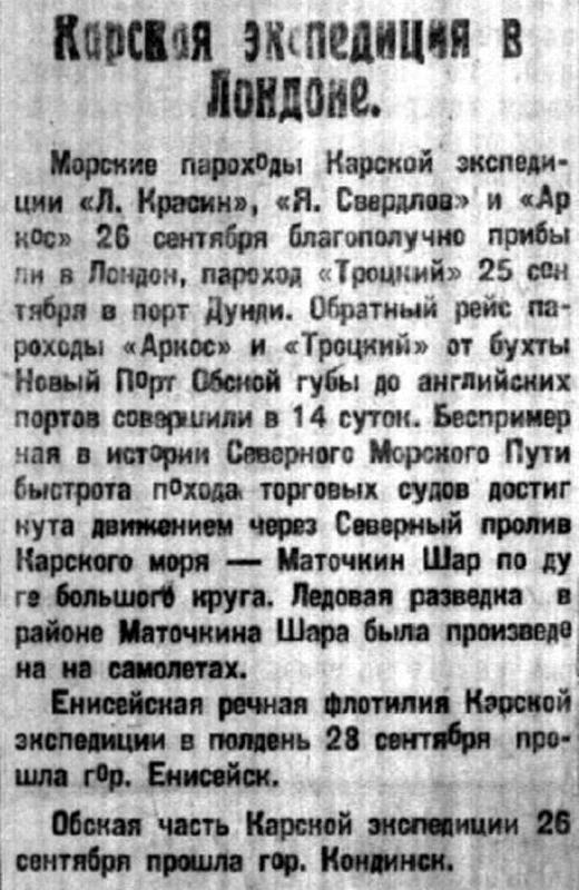 Морские пароходы Карской экспедиции «Л. Красин», «Я. Свердлов» и «Аркос» 26 сентября благополучно прибыли в Лондон, пароход «Троцкий» 25 сентября а порт Дунди. Обратный рейс пароходы «Аркос» и «Троцкий» от бухты Новый Порт Обской губы до английских портов совершили в 14 суток. Беспримерная в истории Северного Морского Пути быстрота похода торговых судов достигнута движением через Северный пропив Карского моря — Маточкин Шаp по дуге большого круга. Ледовая разведка в районе Маточкина Шара была произведена на самолетах.