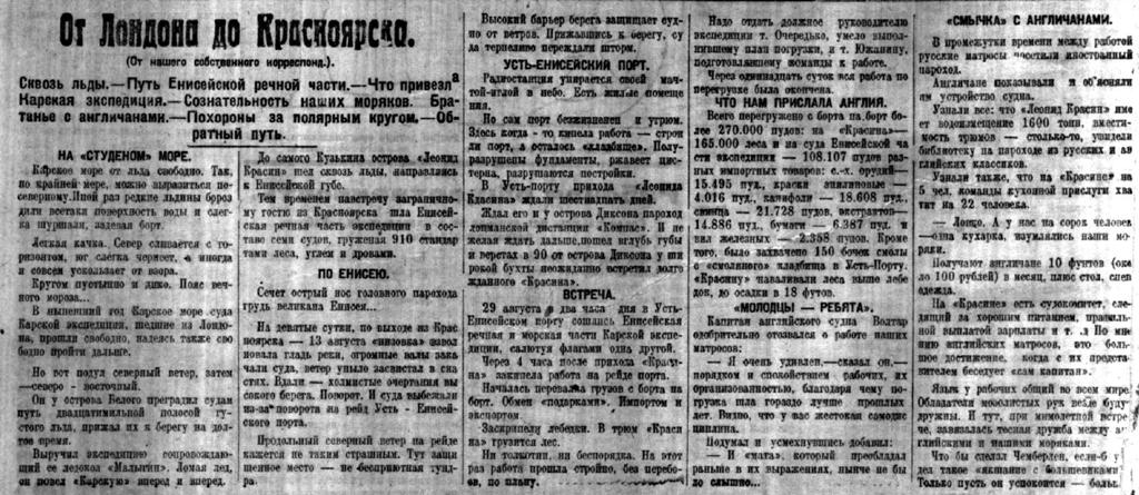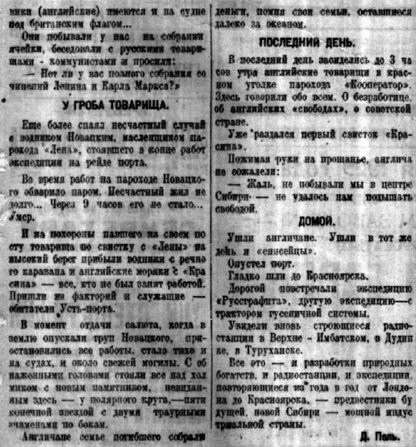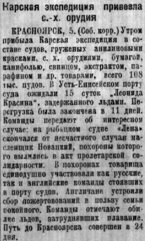 КРАСНОЯРСК, 5. (Соб. корр.) Утром прибыла Карская экспедиция в составе судов, груженых анилиновыми красками, с. х. орудиями, бумагой, канифолью, свинцом, экстрактом, парафином и др. товарами, всего 108 тыс. пудов. В Усть-Енисейском порту суда ожидали 15 суток „Леонида Красина", задержанного льдами. Перегрузка была закончена в 11 дней. Команды передают об интересном случае: на рыбацком судне «Лена» скончался от несчастного случая масленщик Новацкий, похороны которого вылились в акт пролетарской солидарности. В похоронах товарища единодушно участвовали как русские, так и английские команды стоявших в порту судов. Англичане устроили сбор пожертвований в пользу семьи покойного. Команды отвечают обилие льдов, затруднявших плавание. Путь до Красноярска совершен в 24 дня.