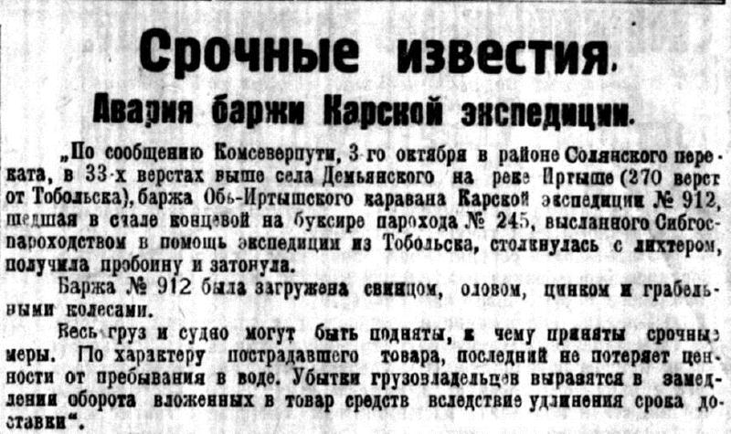 "По сообщению Комсеверпути, 3 го октября в районе Солянского переката, в 33 х верстах выше села Демьянского на реке Иртыше (270 верст от Тобольска), баржа Обь-Иртышского каравана Карской экспедиции № 912, шедшая в счале концевой на буксире парохода № 245, высланного Сибгоспароходством в помощь экспедиции из Тобольска, столкнулась с лихтером, получила пробоину в затонула.