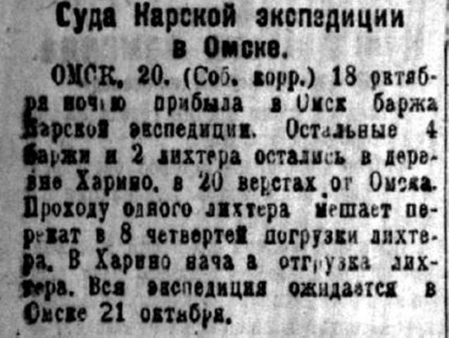 ОМСК. 20. (Соб. корр.) 18 октября ночью прибыла в Омск баржа Карской экспедиции. Остальные 4 баржи и 2 лихтера остались в деревне Харино, в 20 верстах от Омска. Проходу одного лихтера мешает перекат в 8 четвертей погрузки лихтера. В Харино начата отгрузка лихтера. Вся экспедиция ожидается в Омске 21 октября.