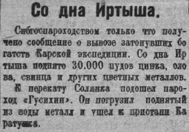 Сибгоспароходством только что получено сообщение о вывозе затонувши богатств Карской экспедиции. Со дна Иртьша поднято 30.000 пудов цинка, олова, свинца и других цветных металлов.