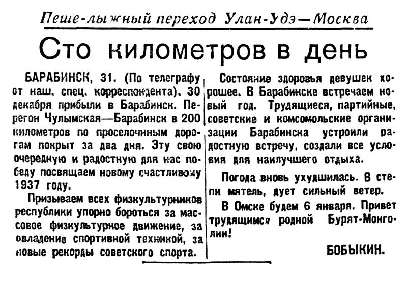 БАРАБИНСК, 31. (По телеграфу от наш. спец. корреспондента). 30 декабря прибыли в Барабинск. Перегон Чулымская — Барабинск в 200 километров по проселочным дорогам покрыт за два дня. Эту свою очередную и радостную для нас победу посвящаем новому счастливому 1937 году.