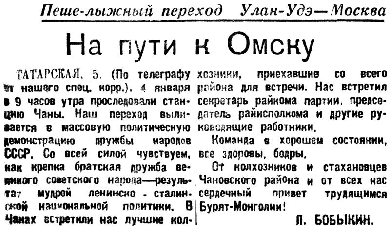 Из Барабинска вышли 2 января уже 1937 года. На имя команды в Барабинске получили много поздравительных телеграмм. Мы тоже не остались в долгу, отвечали всем.