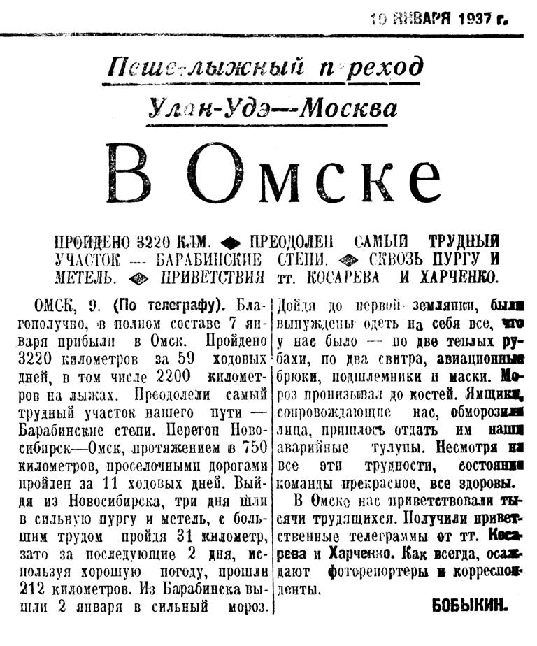 ОМСК, 9. (По телеграфу). Благополучно, в полном составе 7 января прибыли в Омск. Пройдено 3220 километров за 59 ходовых дней, в том числе 2200 километров на лыжах. Преодолен самый трудный участок нашего пути — Барабинске степи. Перегон Новосибирск — Омск, протяжением в 750 километров, проселочными дорогами пройден за 11 ходовых дней. Выйдя из Новосибирска, три дня шли в сильную пургу и метель, с большим трудом пройдя 31 километр, зато за последующие 2 дня, используя хорошую погоду, прошли 212 километров. Из Барабинска вышли 2 января в сильный мороз.