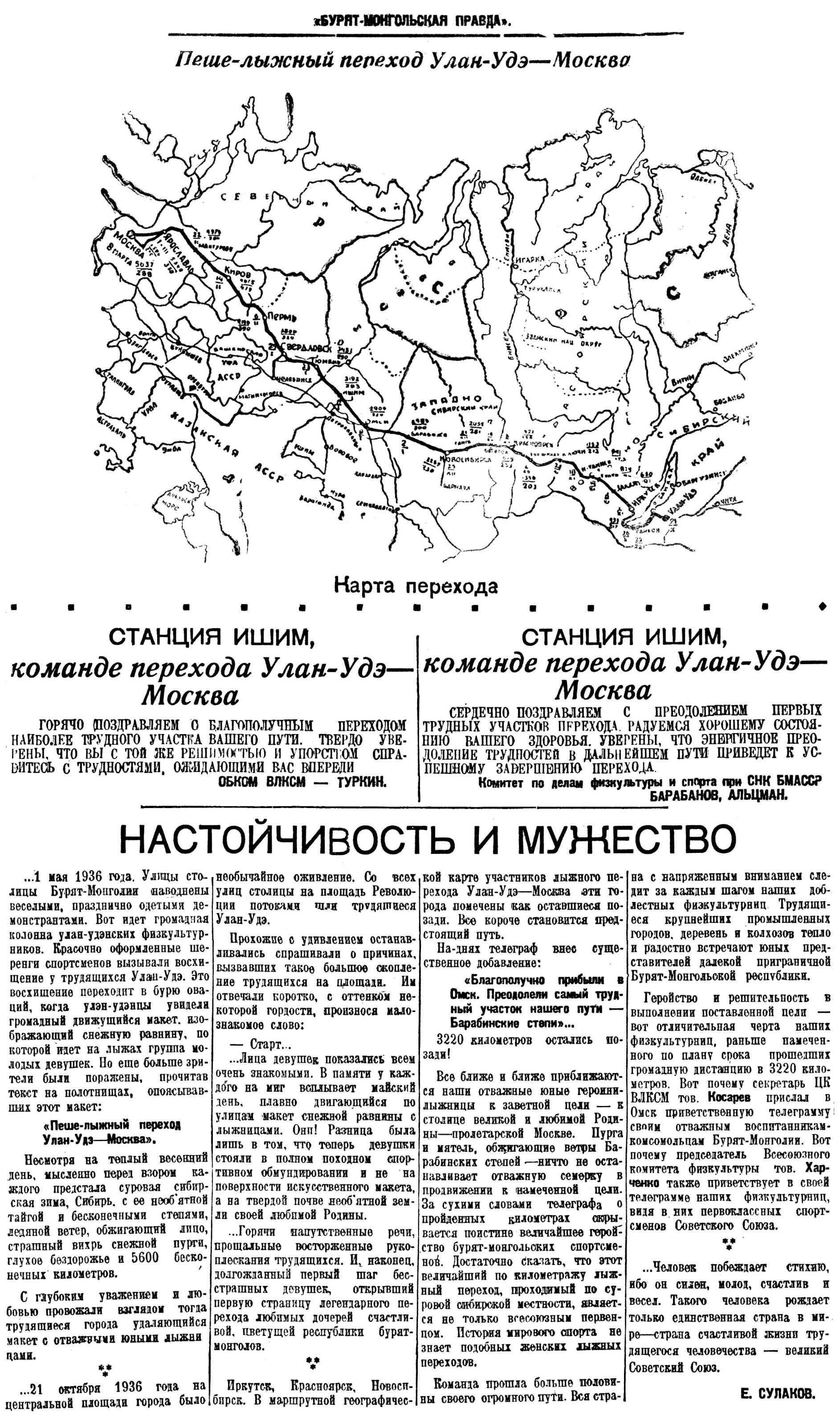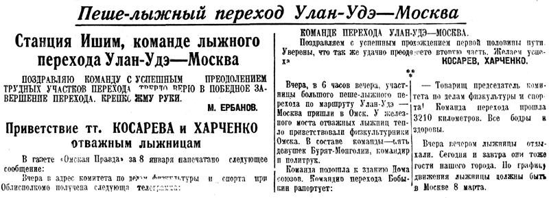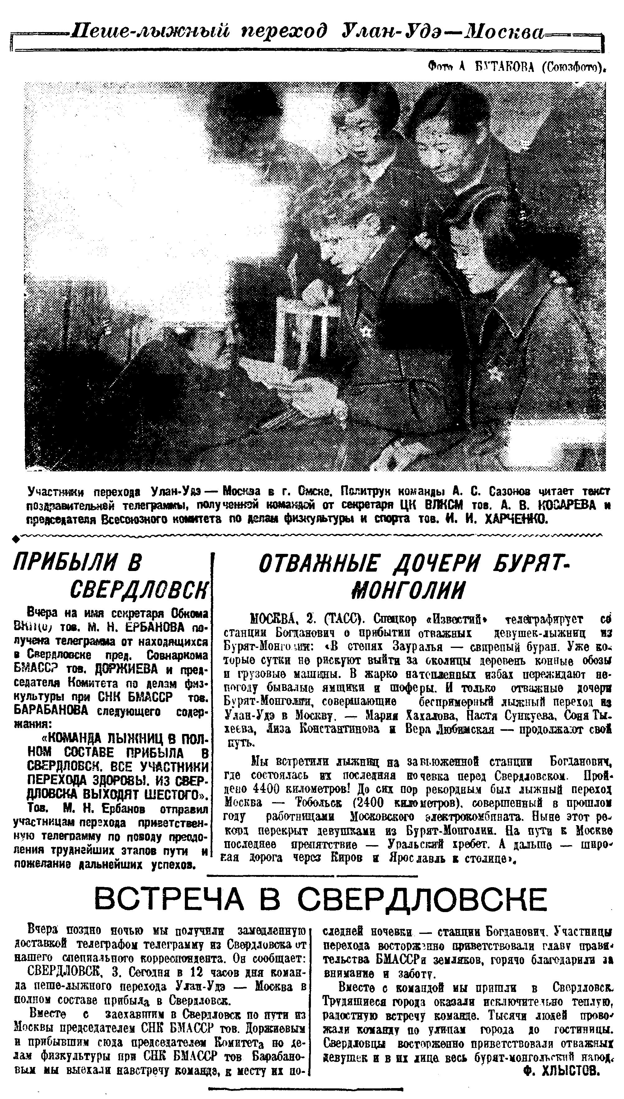 МОСКВА, 2. (ТАСС). Спецкор "Известий" телеграфирует со станция Богданович о прибытии отважных девушек-лыжниц из Бурят-Монголии: "В степях Зауралья — свирепый буран. Уже которые сутки не рискуют выйти за околицы деревень конные обозы и грузовые машины. В жарко натопленных избах пережидают непогоду бывалые ямщики и шоферы. И только отважные дочери Бурят-Монголии, совершающие беспримерный лыжный переход из Улан-Удэ в Москву. — Мария Хахалова, Настя Сункуева, Соня Тыхеева, Лиза Константинова к Вера Любимская — продолжают свой путь.