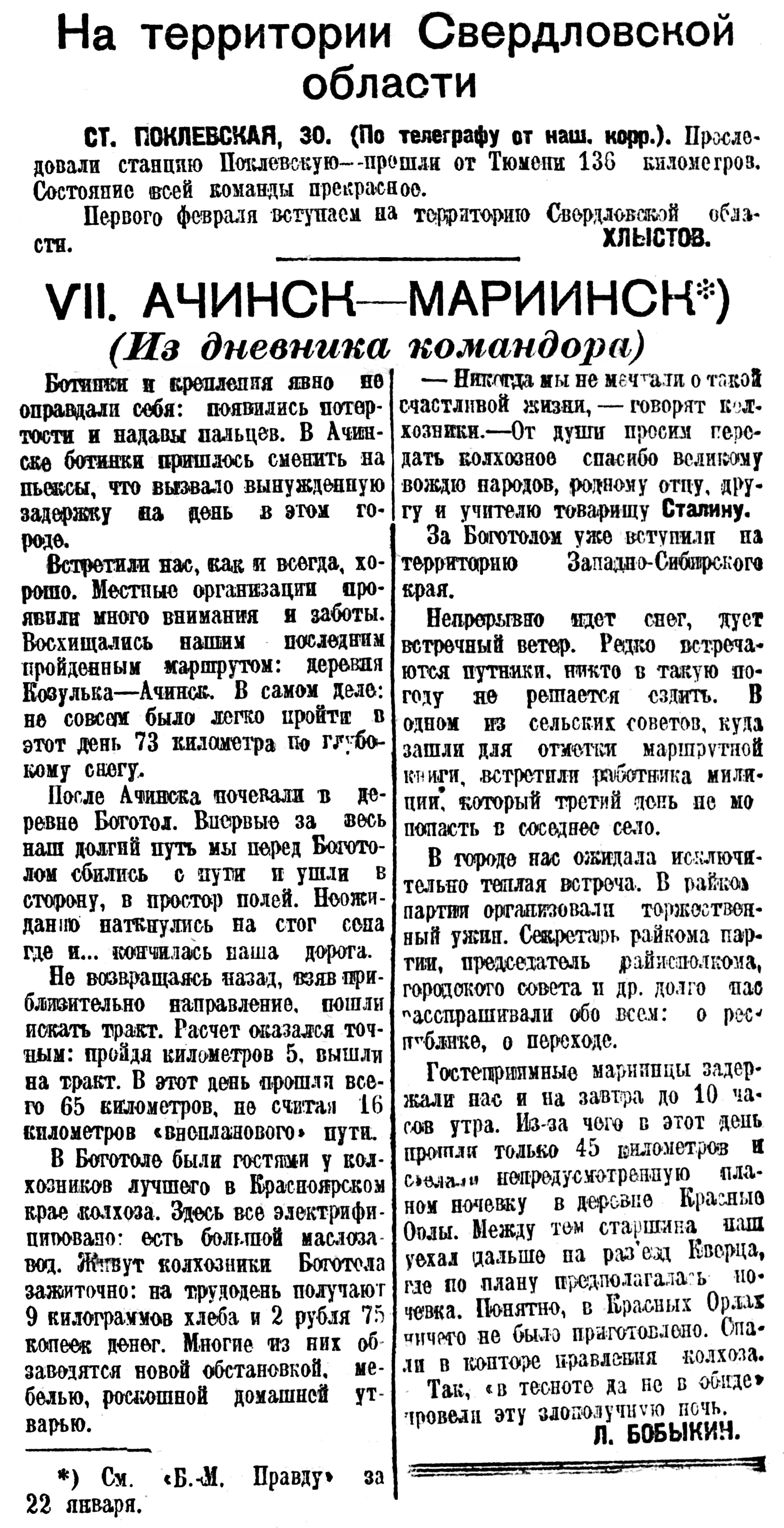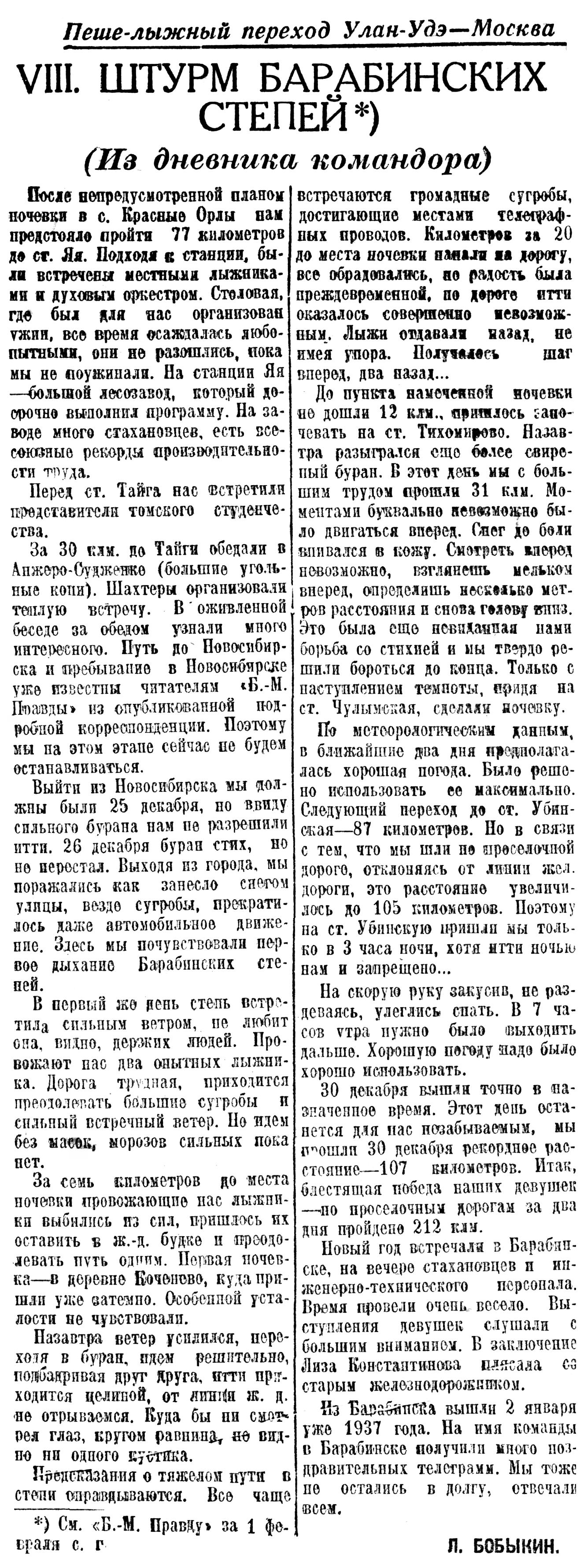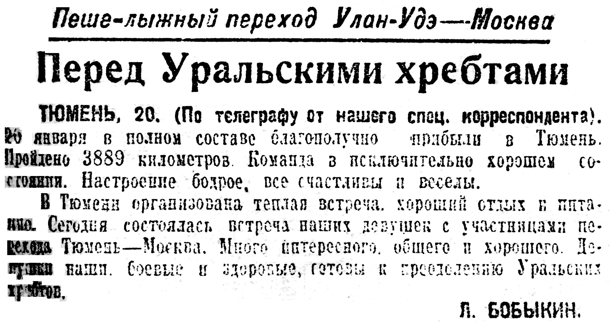 Мы встретили лыжниц на завьюженной станции Богданович, где состоялась их последняя ночевка перед Свердловском. Пройдено 4400 километров! До сих пор рекордным был лыжный переход Москва — Тобольск (2400 километров), совершенный в прошлом году работницами Московского электрокомбината. Ныне этот рекорд перекрыт девушками из Бурят-Монголии. На пути к Москве последнее препятствие — Уральский хребет. А дальше — широкая дорога через Киров и Ярославль к столице».