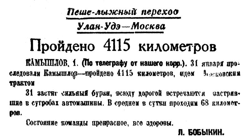 2 января — в команде большая радость. На последнем привале во время обеда в деревне Косулино, что в 30 километрах от Свердловска, прибывший навстречу председатель Комитета по делам физкультуры и спорта при СНК БМАССР тов. Барабанов сообщил о скором прибытии председателя Совнаркома республики тов. Доржиева, который возвращаясь со Всероссийского съезда Советов, остановила для встречи команды а Свердловске. Ликованию девушек не было границ. Когда т в. Доржиев зашел в дом, равдалась команда "смирно", и командор перехода тов. Бобыкин подошел к тов. Доржиеву, четко, но военному отдал рапорт: