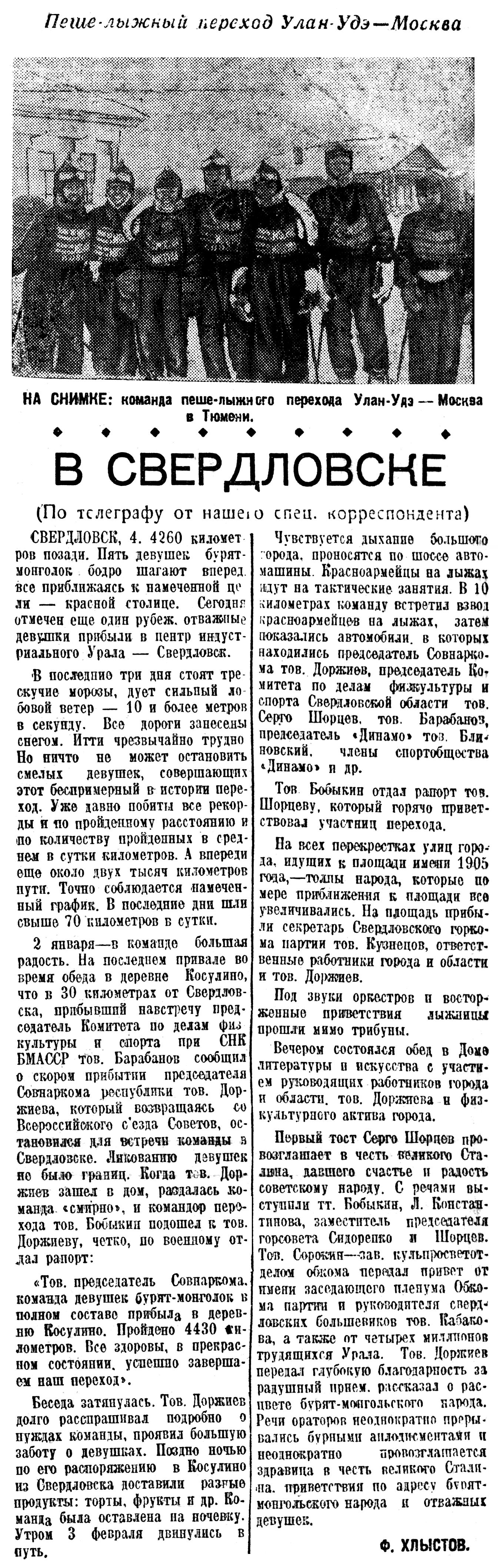 Вместе с командой мы пришли в Свердловск. Трудящиеся города оказали исключительно теплую, радостную встречу команде. Тысячи людей провожали команду по улицам города до гостиницы. Свердловцы восторженно приветствовали отважных девушек и в их лице весь бурят-монгольский народ.
