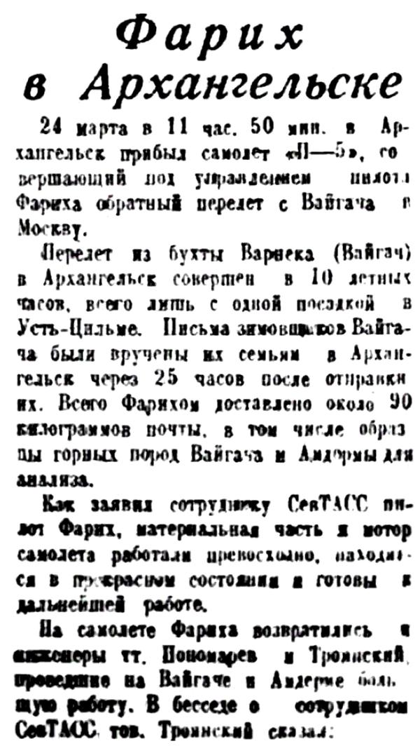 По сообщению с Вайгача, летчик Ф. Б. Фарих вчера должен был стартовать из Вайгача на Архангельск и, таким образом начать обратный рейс Вайгач — Москва. Но густой туман и пурга в районе Варнека и на трассе заставили вылет отложить. Если позволит погода, Фарих покинет Вайгач сегодня утром. Путь до Архангельска летчик-краснознаменец рассчитывает покрыть без посадки.