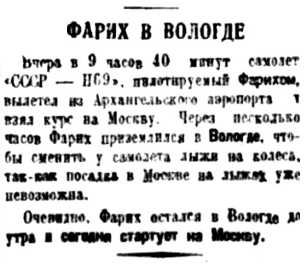 Вчера в 9 часов 40 минут самолет "СССР — Н69", пилотируемый Фарихом, вылетел из Архангельского аэропорта и взял курс на Москву. Через несколько часов Фарих приземлился в Вологде, чтобы сменить у самолета лыжи на колеса, так-как посадка в Москве на лыжах уже невозможна.